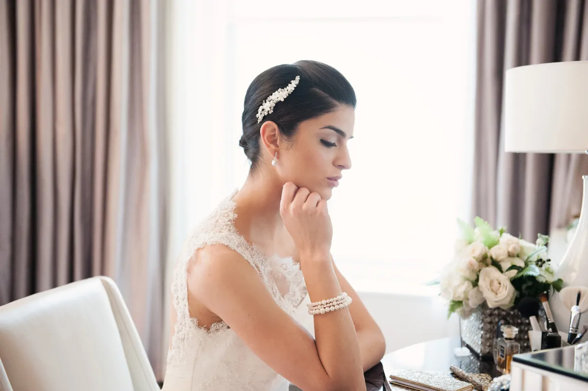 تعتبر حبّات اللؤلؤ من أجمل الأحجار التي يمكن أن تتزيني بها في يوم الزفاف بفضل لونها الصدفي الأخاذ، وذلك بسبب تناغمها مع فستانك الأبيض لتأسري القلوب بإطلالتك الساحرة.