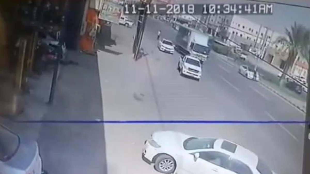 وكان الفيديو الذي التقطته إحدى كاميرات المراقبة قد بين نزول الشاب من إحدى السيارات ومحاولته عبور الطريق مسرعًا حيث تمكن من تجاوز شاحنتين كانتا على الطريق، لتصطدم به سيارة صغيرة كانت تسير بسرعة وتقذفه عاليًّا في الهواء.