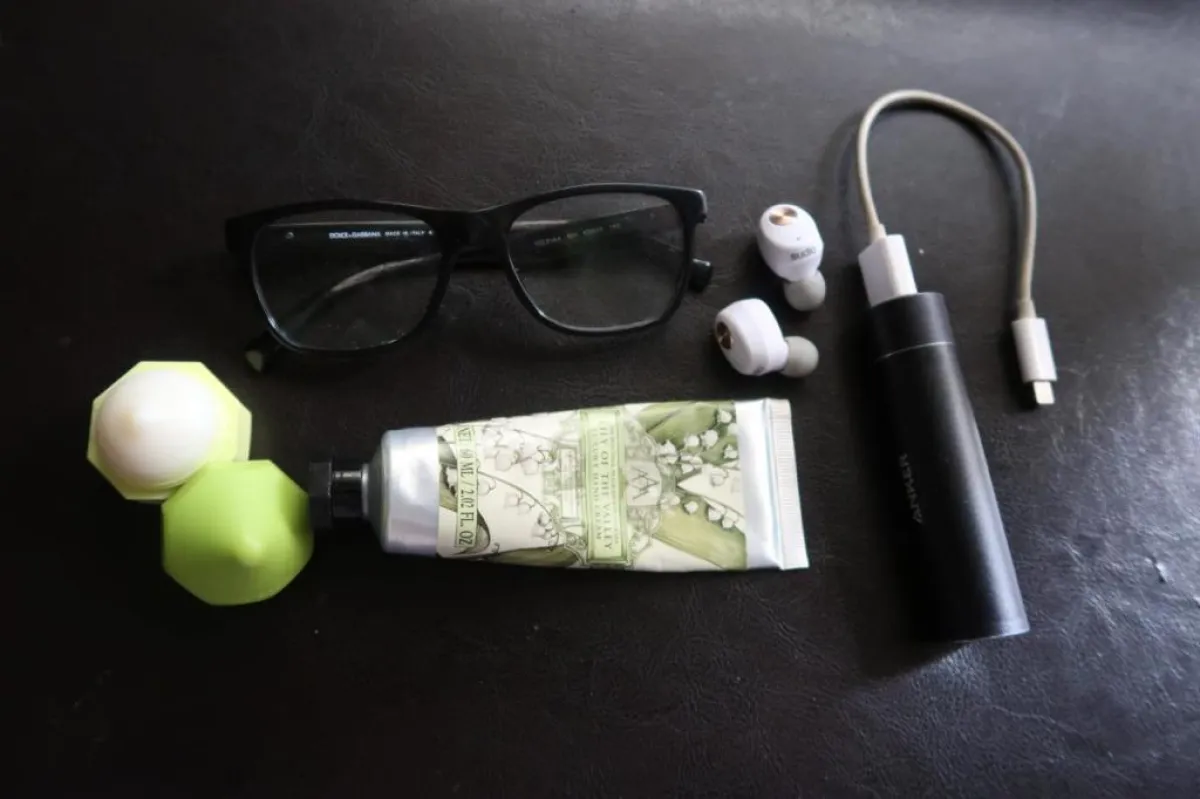 أحمل معي سماعات "سوديو" اللاسلكية لأستمع إلى كتاب صوتي، أو حتى سلسلة أغنيات خارج المنزل، كما لا أستطيع الاستغناء عن نظارتي التي تعينني على القراءة وتصفح الهاتف، ولحرارة الأجواء في السعودية أهتم بترطيب شفتَي ويدي بشكل مستمر.