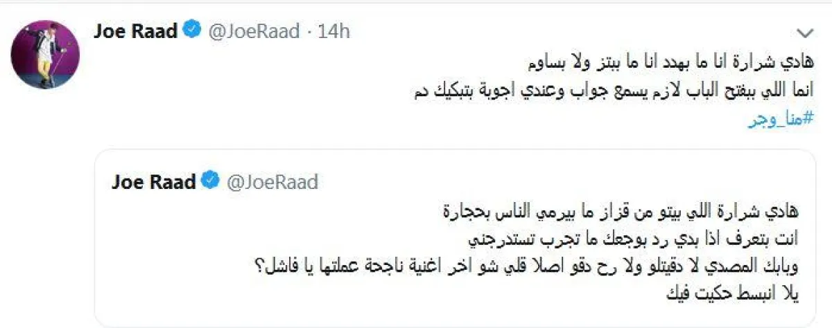 لم تكد تمرّ دقائق حتى ردّ جو عبر حسابه الخاص على "تويتر"، واصفاً باب هادي بالصدأ الذي لا يطرقه أحد، متسائلاً عن آخر أغنية ناجحة أطلقها هادي. وكتب جو تغريدة قاسية جاء فيها "هادي شرارة اللي بيتو من قزاز ما بيرمي الناس بحجارة انت بتعرف اذا بدي رد بوجعك ما تجرب تستدرجني. وبابك المصدي لا دقيتلو ولا رح دقو. اصلا قلي شو اخر اغنية ناجحة عملتها يا فاشل؟ يلا انبسط حكيت فيك".