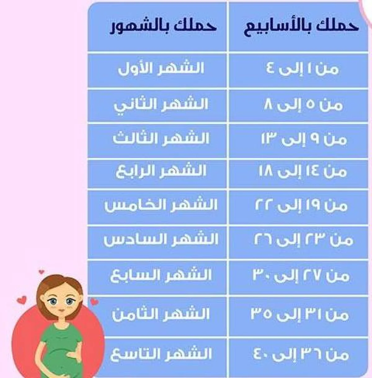 هل تريدين معرفة حملك بالأسبوع؟، بالطبع تريدين لأن الطبيب يحسب الحمل بالأسبوع، ولذلك نقدم لك الجدول التالي لحساب حملك، وتكتشفين من خلاله أن كل أربعة أسابيع تعني شهرا كاملاً من شهور الحمل التسعة، ولذلك تابعي الجدول التالي: