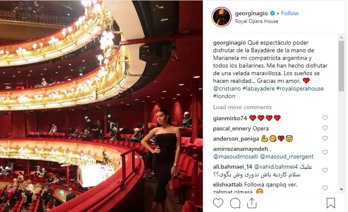 وتابعت الـ«آس»، أن الثلاثي كانوا قد استغلوا فرصة تواجدهم في لندن، لحضور مواجهة الصربي «نوفاك ديوكوفيتش» والأميركي «جون إيسنر» خلال مواجهات البطولة الختامية لكرة التنس الأرضي. وبعدها، فاجأ «رونالدو» صديقته «رودريغيز»، المعروف عنها حبها لرقص الـ«باليه»، بدعوتها إلى دار الأوبرا الملكية لحضور عرض «باليه لابايادير» الشهير، وكان ذلك ليلة الثلاثاء الماضي 13 تشرين الثاني / نوفمبر 2018، وكانت «جورجينا رودريغيز»، قد نشرت صورة من دار الأوبرا الملكية في لندن، على حسابها في موقع الصور «إنستغرام»، وكتبت معلقة عليها قائلة: «حلمي تحقق.. شكرًا حبيبي».