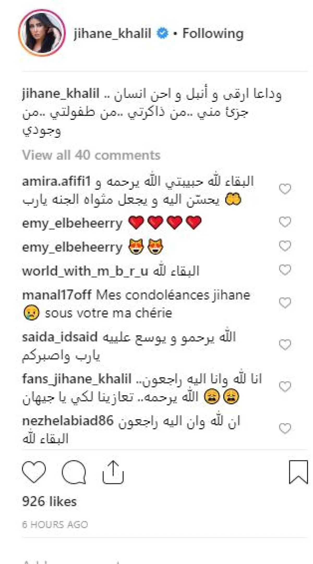توفي فجر اليوم الأحد خال الفنانة المغربية المقيمة في مصر جيهان خليل، ونشرت عبر صفحاتها الشخصية على الفيس بوك وإنستقرام، صورة سوداء إشارة للحداد، وعلقت عليها بعبارة رثاء قصيرة قائلة: وداعا أرقى وأنبل وأحن إنسان.. جزء مني.. من ذاكرتي.. من طفولتي.. من وجودي.