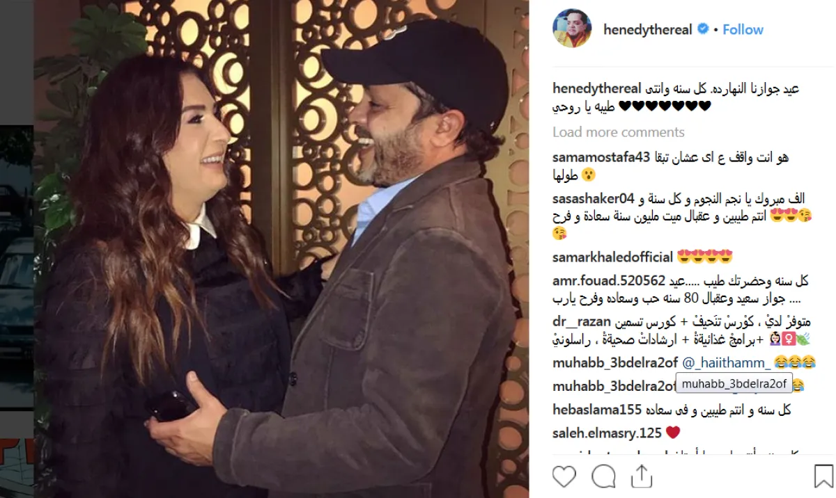 على الجانب الآخر نشر الفنان محمد هنيدي صوراً مع زوجته وذلك عبر صفحته الشخصية على موقع التواصل الاجتماعي إنستقرام وذلك بمناسبة عيد زواجه وقدم لها التهنئة بعيد زواجهما قائلاً لها:" عيد جوازنا النهارده. كل سنه وانتي طيبه يا روحي". وذلك على الرغم أنه يحرص أن تكون عائلته وحياته الشخصية بعيدة عن الأضواء.