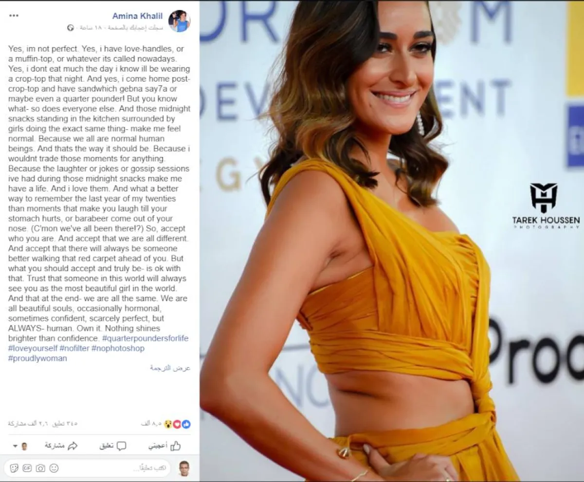 أمينة علقت على الصورة عبر صفحتها الشخصية بموقع الفيس بوك قائلة: نعم لست مثالية، ولدي أجناب تدعونها مقابض الحب أو حلوى الـ(مافن)، لا أعلم ما تطلقون عليها الآن، وفي اليوم الذي ارتدي فيه قميصا قصيرا يكشف بطني لا آكل كثيرا، لكن بعد عودتي من تلك الليلة أعوض كل ما فاتني، أتعرف لماذا، لأننا كلنا نفعل ذلك.