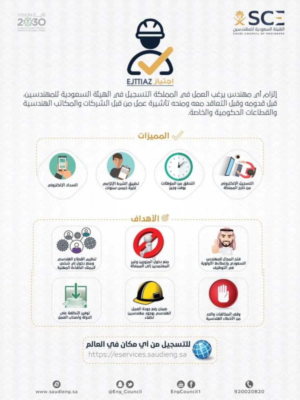 وقال: "تتميز الخدمة بالسرعة، والسهولة في التسجيل، وإرسال المؤهلات العلمية وشهادات الخبرة والأوراق الثبوتية في وقت وجيز، وتعتمد الخدمة على تطبيق الشرط الإلزامي خمسُ سنواتٍ خبرة لأي مهندس يرغب في العمل بالسعودية".