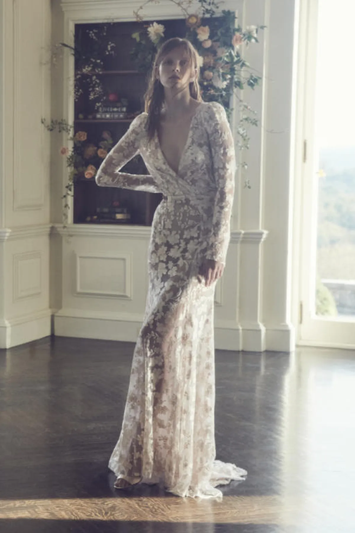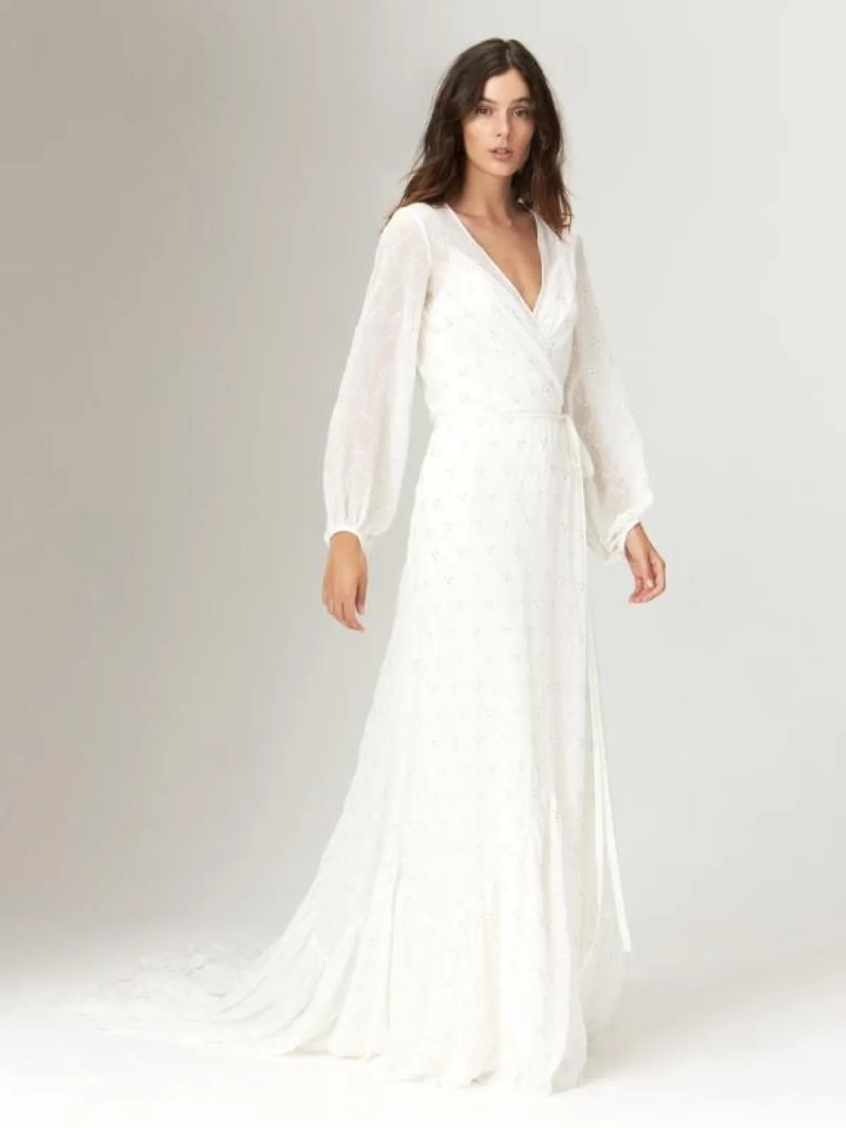 وللـ عروس التي تبحث عن فستان زفاف محتشم، إختاري فستان زفاف Wrap بأكمام طويلة مثل فستان سافانا ميلر Savannah Miller.