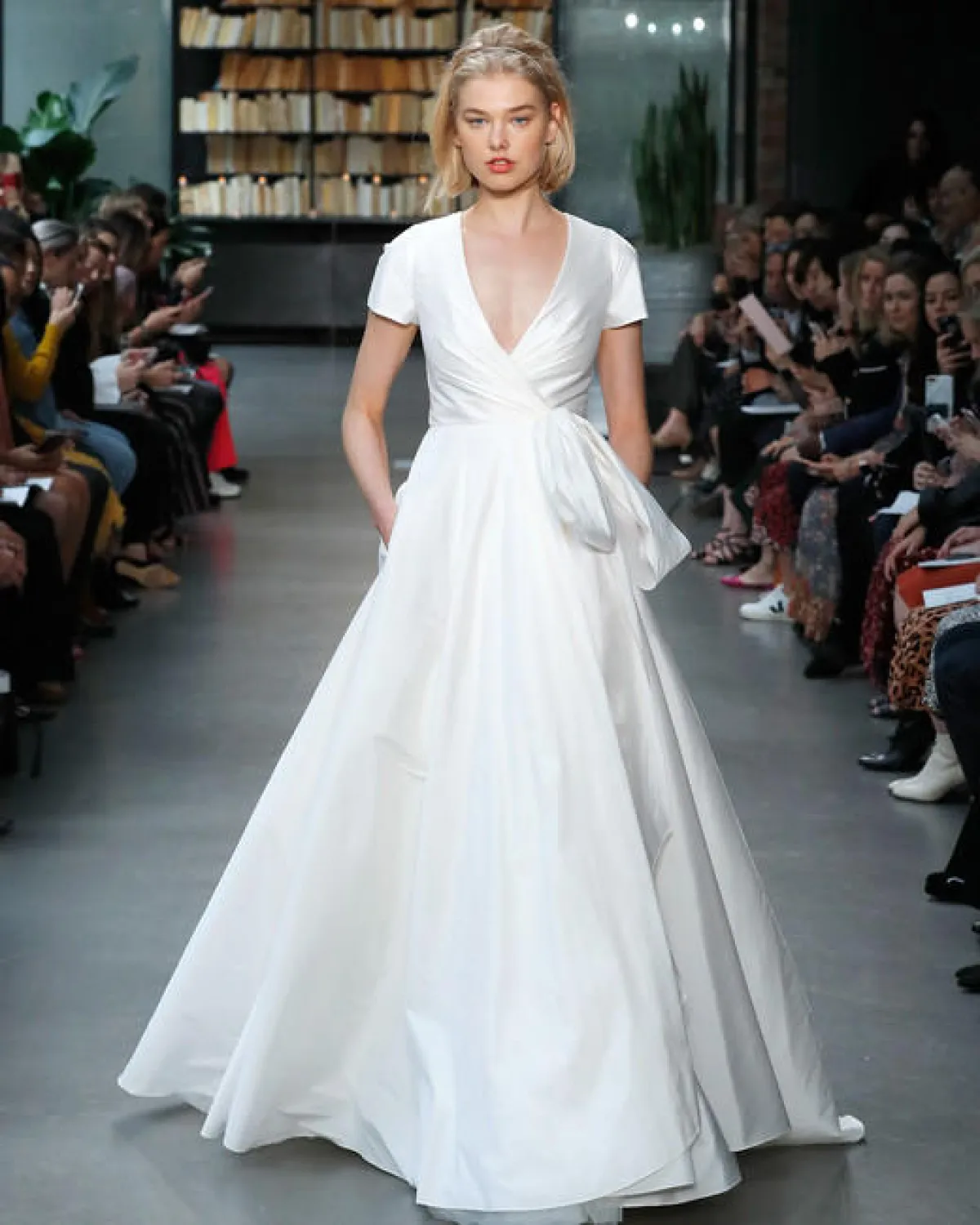 يمكن إختيار فستان Wrap مع تنورة منفوشة، مثل فستان زفاف Amsale ذو التصميم العصري البسيط.