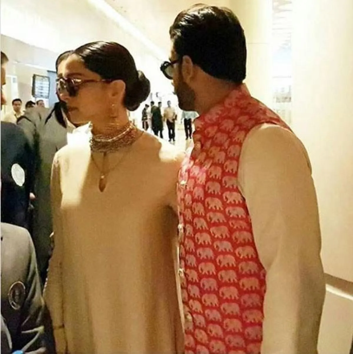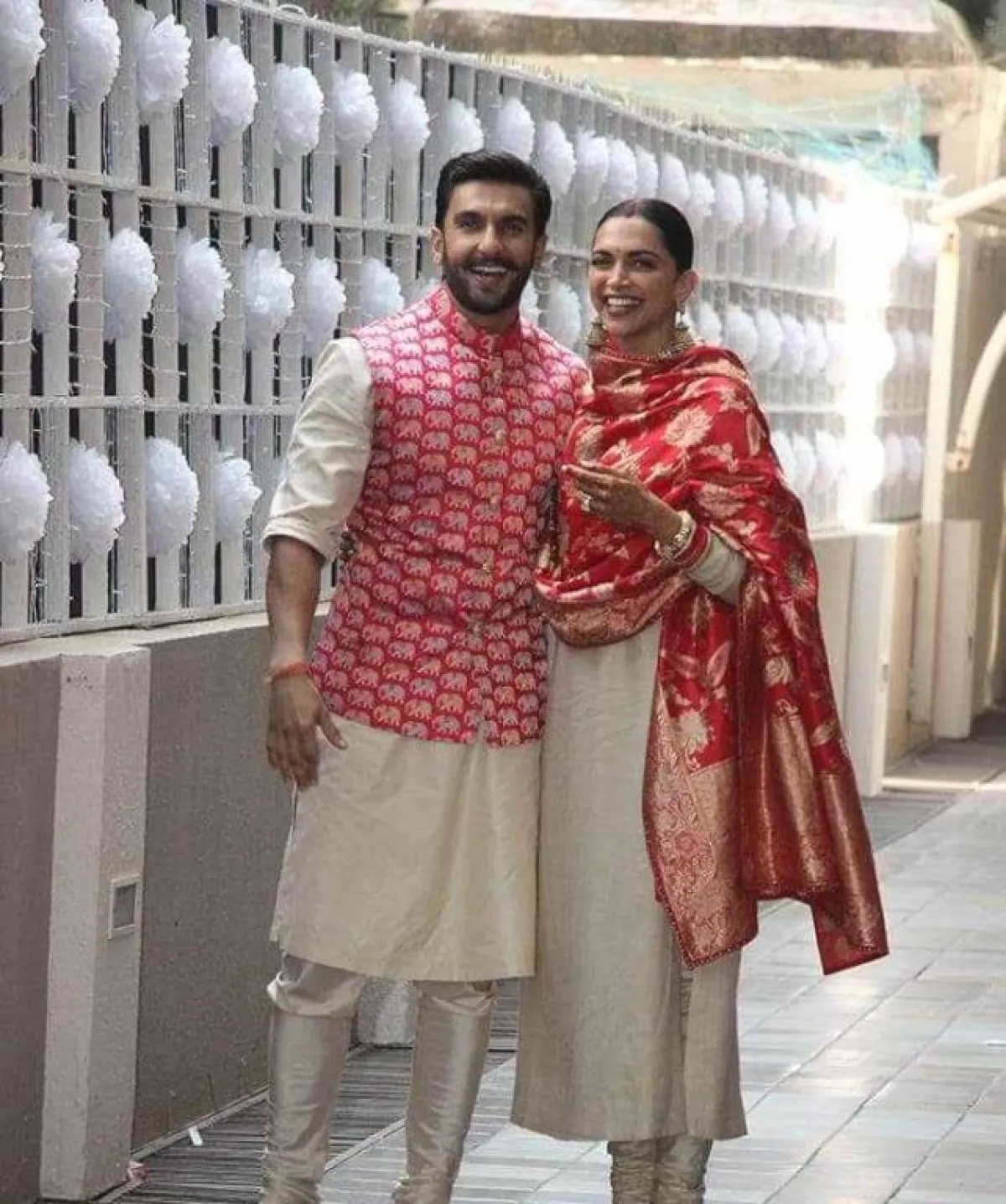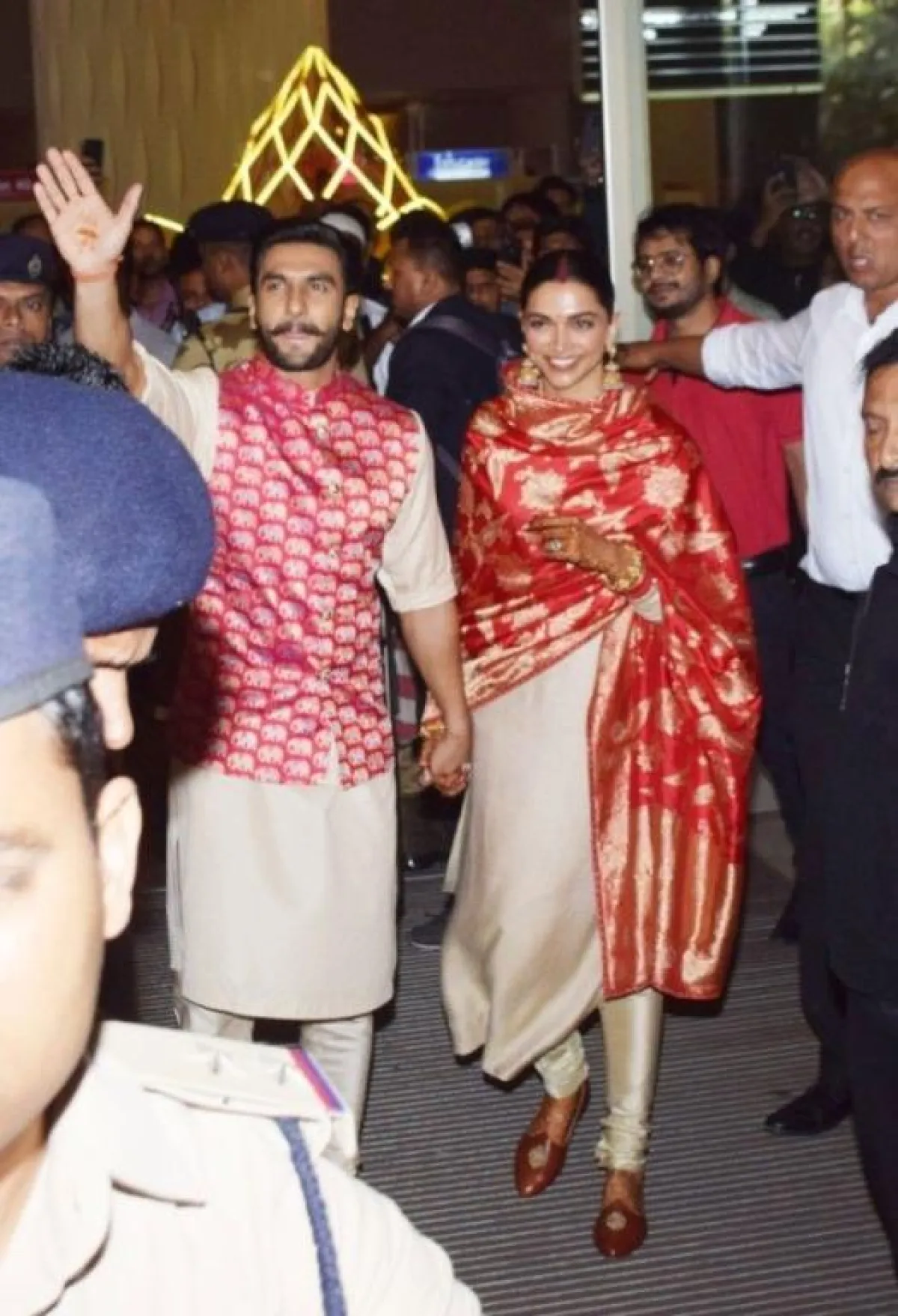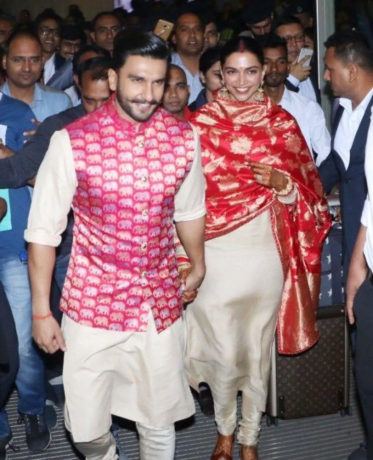 وارتدت العروس الجديدة بدلة كريمي مقترنة بقطعة حمراء من الجلد الحريري والمجوهرات التقليدية، في حين قام رانفير بتنسيق ثوبه مع ديبيكا مرتدياً سترة حمراء.