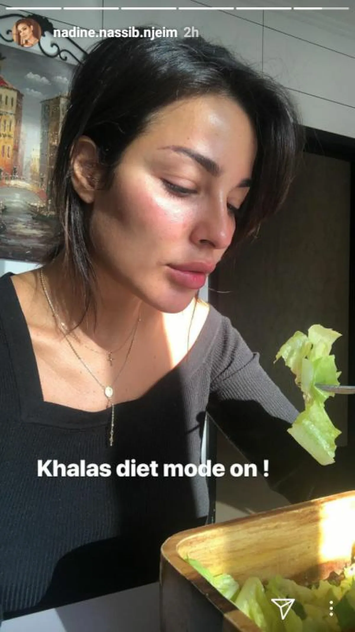 نشرت الفنانة نادين نجيم عبر حسابها على "إنستا ستوري" صورة لها وهي تتناول الخس، مشيرة إلى أنها قررت البدء باعتماد نظام غذائي.