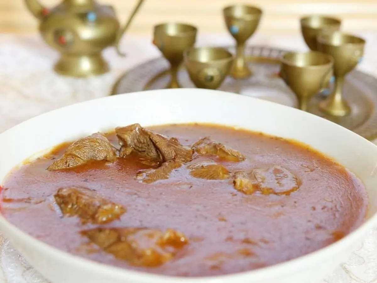 3- في الماء، نذوّب النشاء جيّداً، ونضع معه معجون الطماطم ونخفقهم، ثمّ نسكب المزيج فوق اللحمة، مع وضع غطاء على نار هادئة لمدّة ساعة حتّى تتمّ عمليّة النضوج.