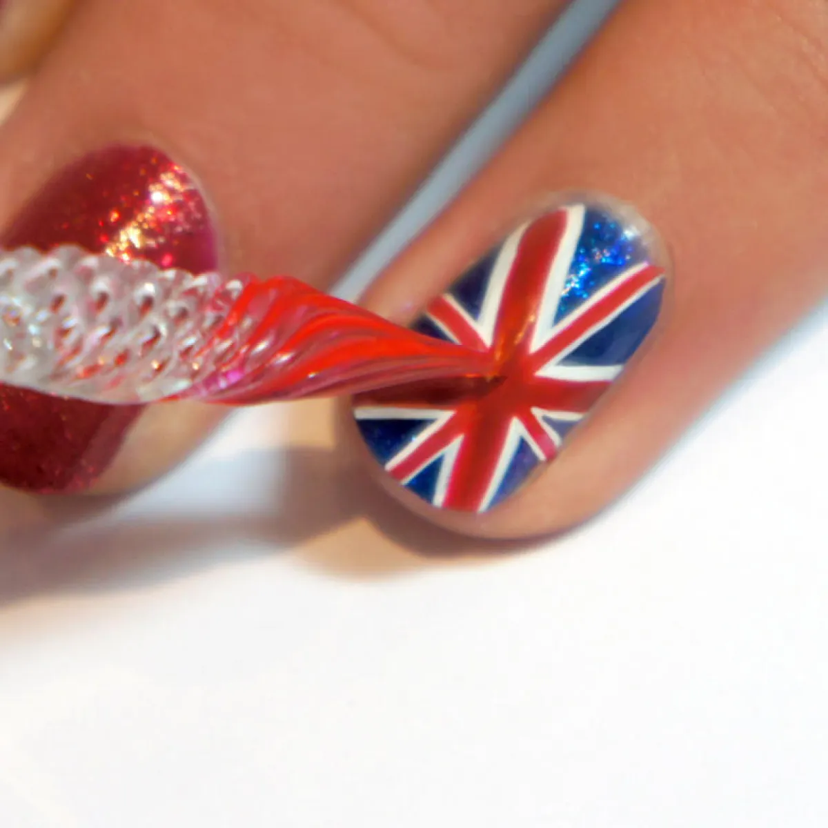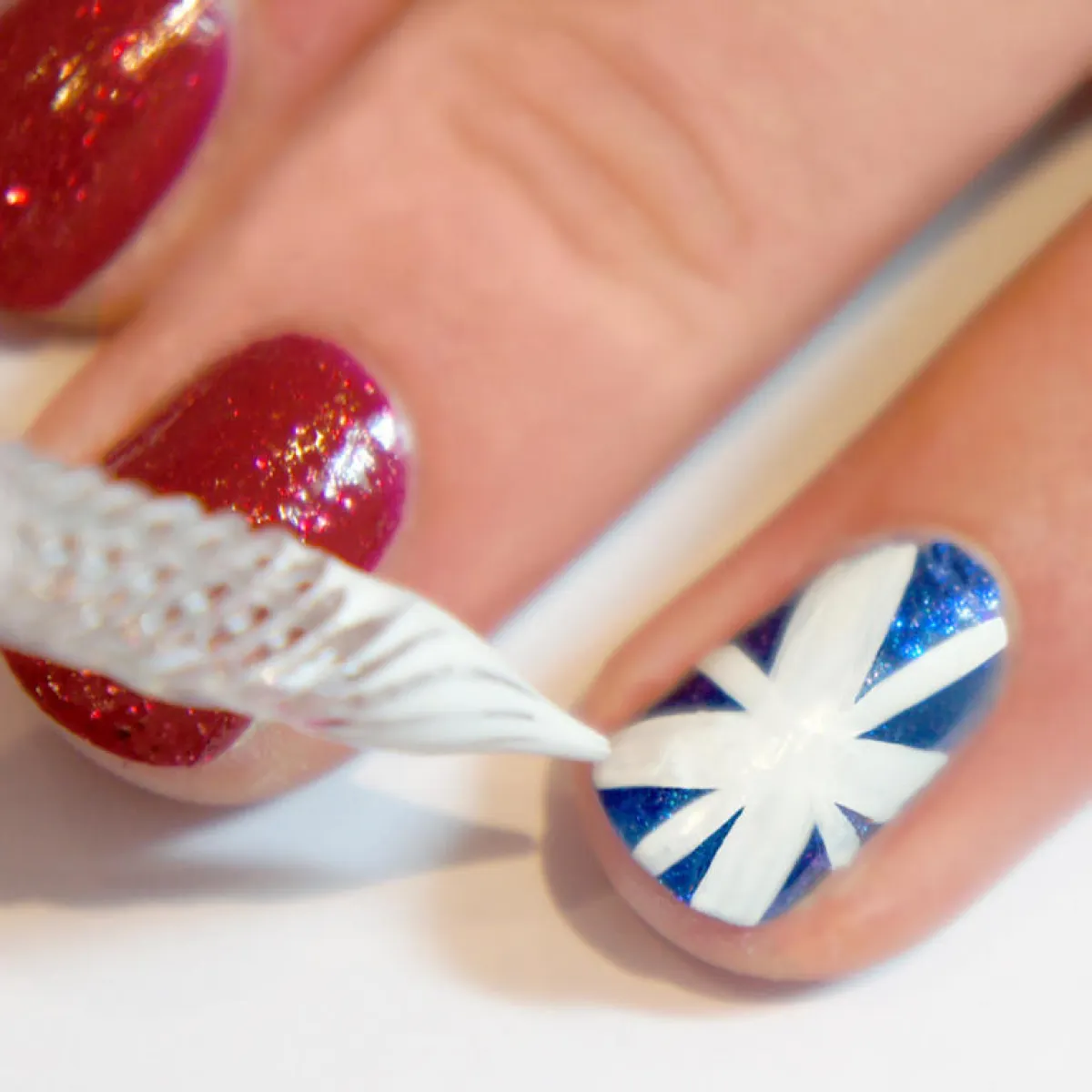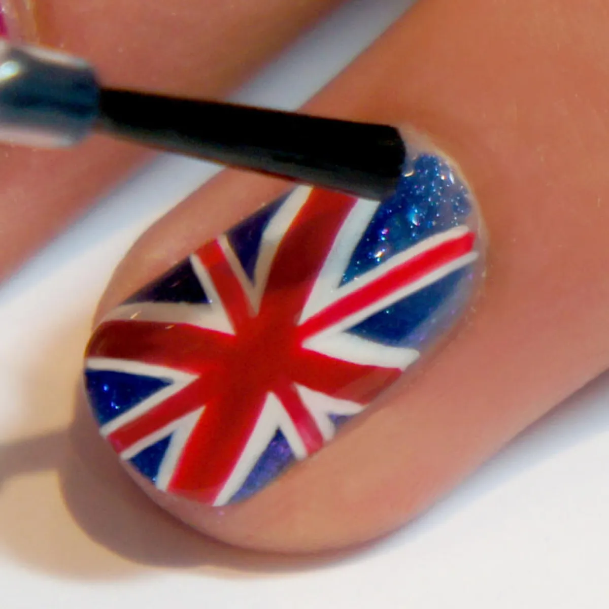 4.أكملي رسم أصبعك بالطِّلاء الأبيض حتّى يتمّ إكمال تصميم العلم البريطانيّ.