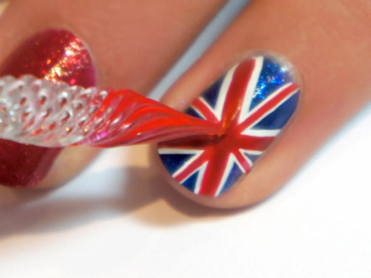 7.يمكنكِ الاكتفاء برسم العلم البريطانيّ على واحد من أظافرك، مع ترك الأظافر الأخرى باللون الأزرق الملكيّ اللامع. وإن كنتِ تحبِّين المظهر اللافت، يمكنكِ رسم العلم البريطانيّ على أظافرك جميعها.