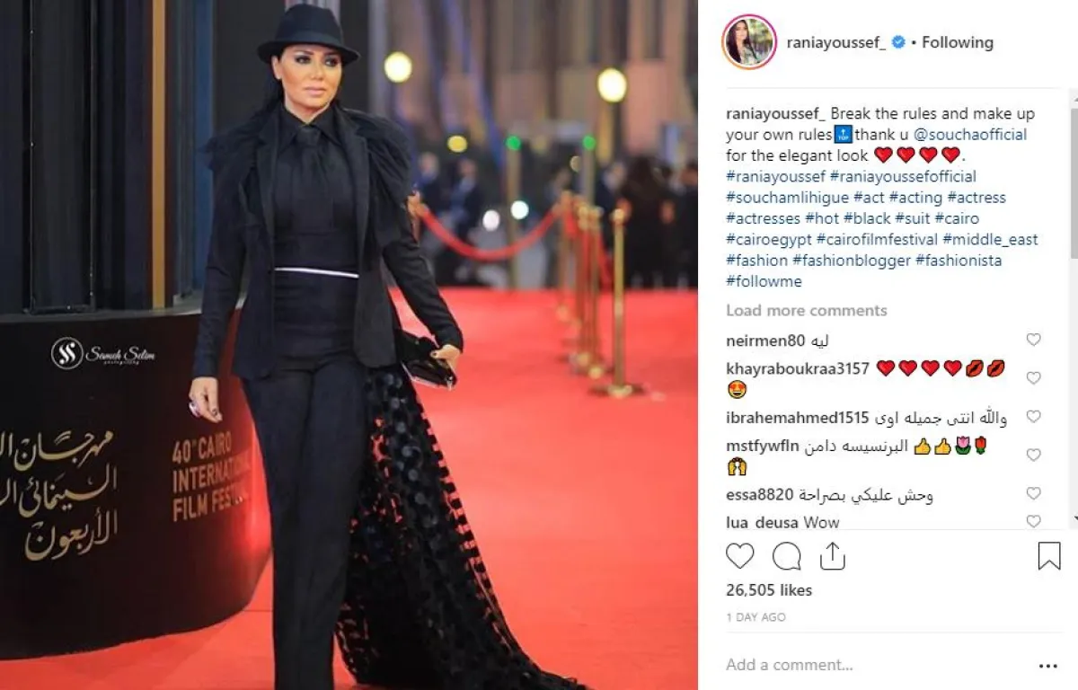 تصدت الفنانة المصرية رانيا يوسف لحملات السخرية من اطلالتها في حفل افتتاح فعاليات الدورة الـ40 لمهرجان القاهرة السينمائي، وقامت بإعادة نشر صورتها عبر حسابها الخاص بموقع انستقرام، مع تعليق أكدت فيه أنها تعمّدت كسر القواعد.