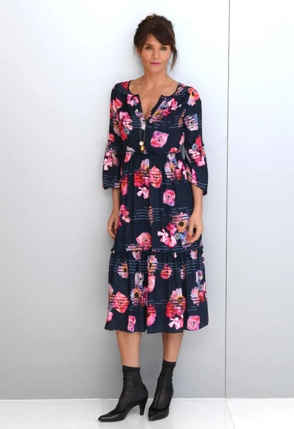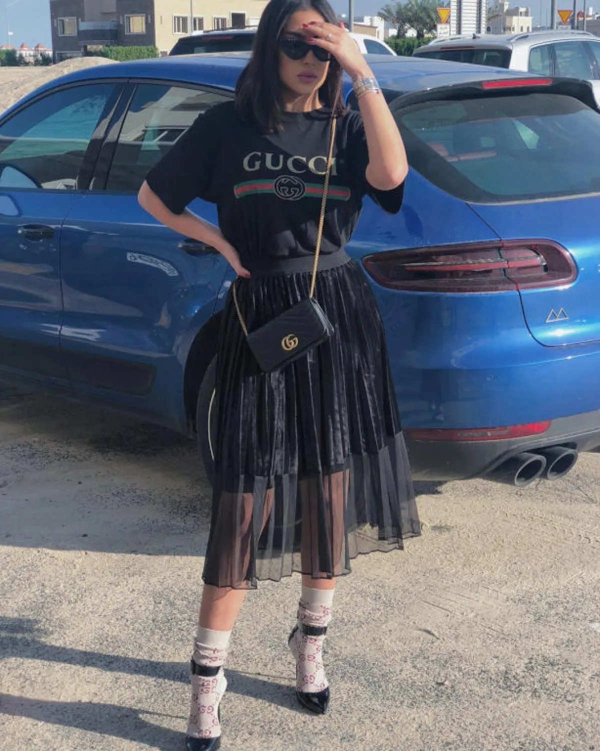أطلت فرح الهادي معتمدة زوجاً من جوارب ماركة غوتشي مع حذاء الـpump بكعب عالٍ بحزام يلف الكاحل، واختارت مع هذه الصيحة العصرية تنورة ميدي سوداء مزينة بطيات البليسيه من المخمل من الموسلين الشفاف، ونسبته مع تي شيرت مزين بشعار غوتشي، الماركة المفضلة لديها، ويمكننا القول إن الإطلالة بالكامل جريئة وعصرية تناسب شابة بعمرها نفسه.