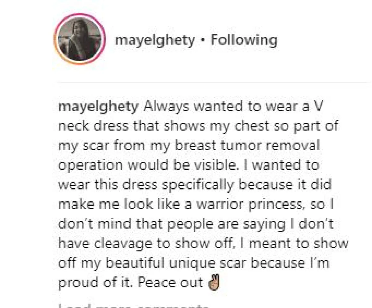 أضافت تعليقا على صورتها من حفل افتتاح مهرجان القاهرة السينمائي: أردت دائما أن أرتدي فستانا على شكل V يظهر أنني فخورة بالتصدي للورم، وهذا الفستان جعلني أبدو وكأنني أميرة محاربة، لهذا لم التفت لمن علق على خلو صدري من مظاهر الأنوثة، فما قصدته هو دفع الجميع لعدم الخجل من أثر الجراحة.