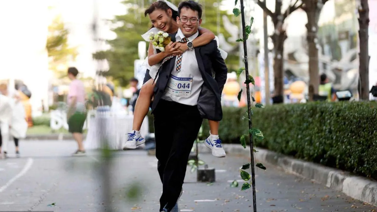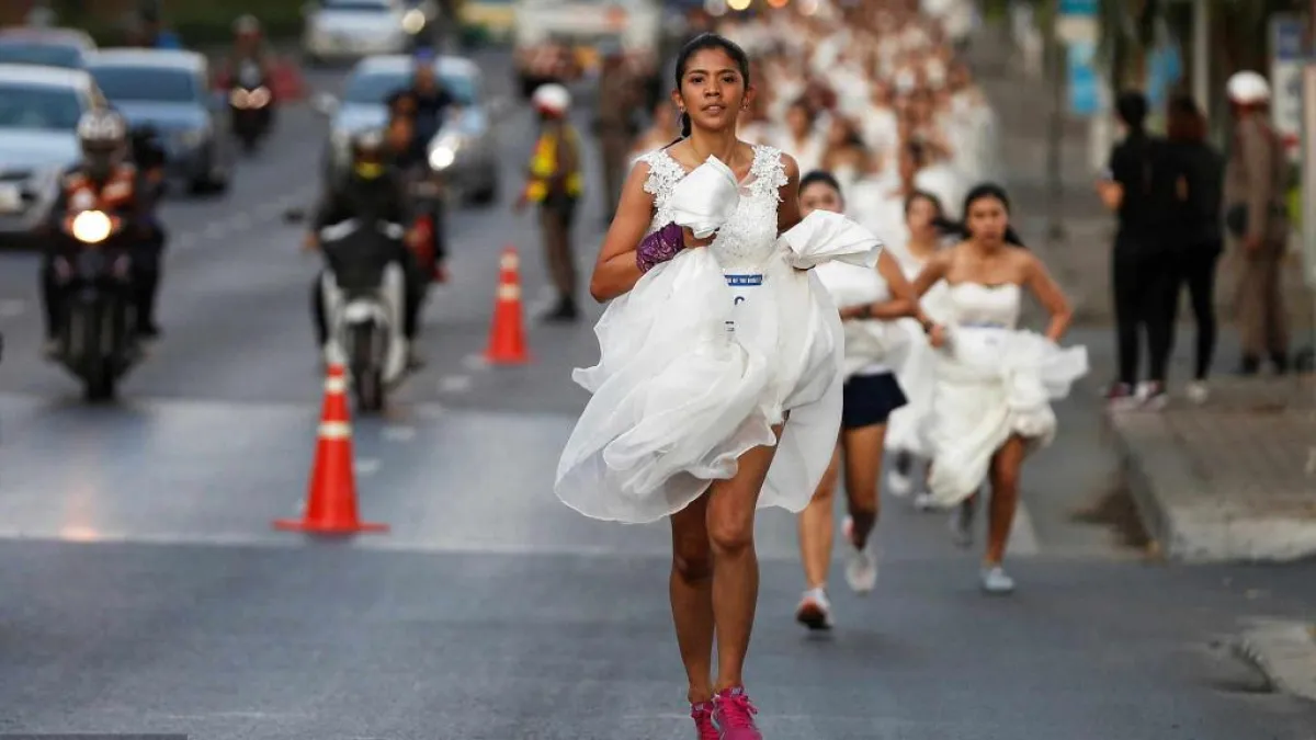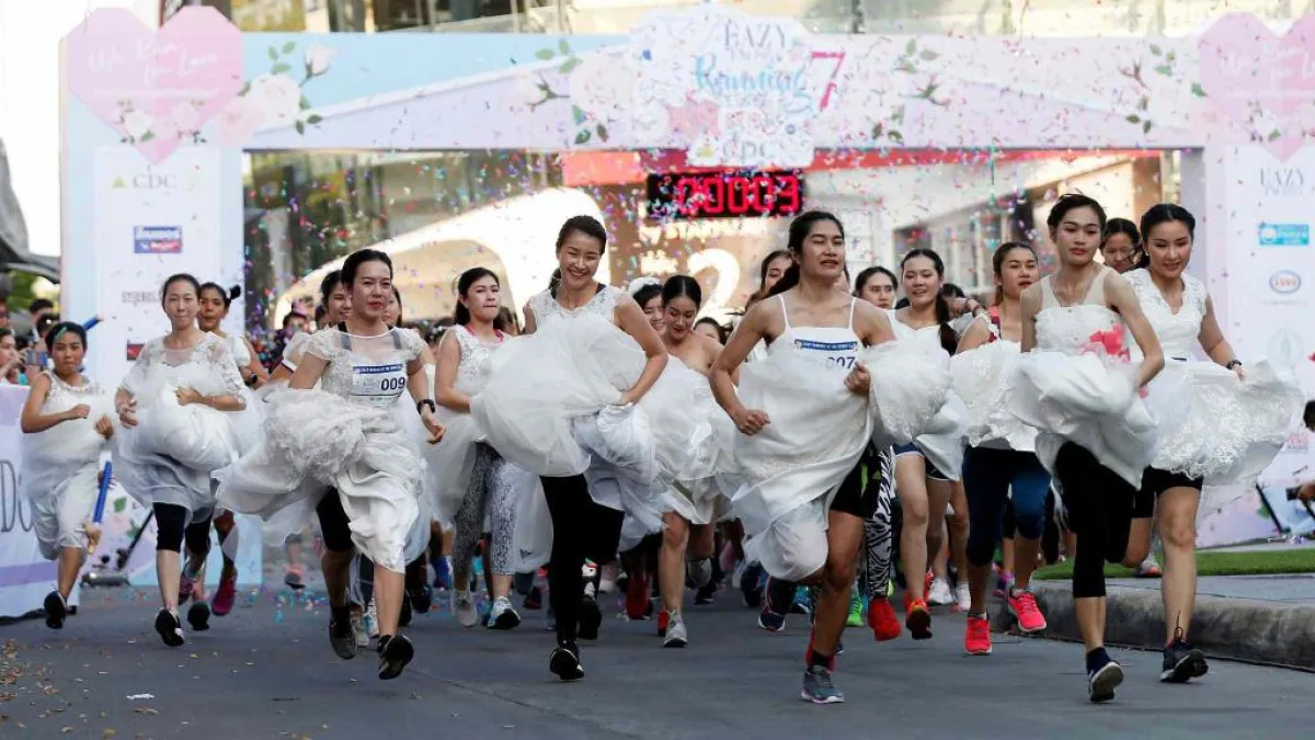في سباق فريد من نوعه بعنوان «جري العرايس» يأخذ هذا الحدث السنوي مكانه للزوجين في بانكوك بتايلاند. وبحسب موقع «CGTN» شارك في هذه المسابقة أكثر من 300 عريس وعروس من تايلاند في هذا الحدث لإنهاء الجري لمسافة 3 كيلومترات.