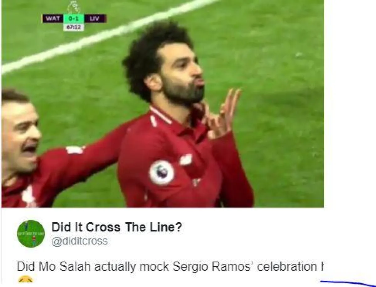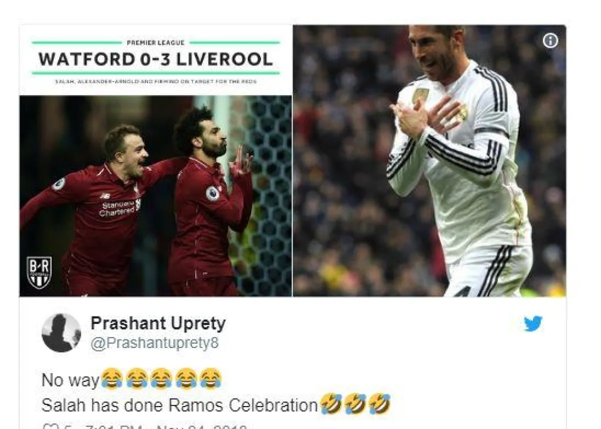 في واقعة طريفة سخر نجم ليفربول المصري محمد صلاح من عدوه اللدود سيرجيو راموس لاعب ريال مدريد الأسباني وذلك بعد تسجيل محمد صلاح للهدف الأول مع فريقه ليفربول فى مواجهة نادي واتفورد فى الدوري الإنجليزي «البرلميرليج» والتي فاز خلالها ليفربول بثلاثية نظيفة ليحتل المرتبة الثانية فى ترتيب الدوري الإنجليزي.