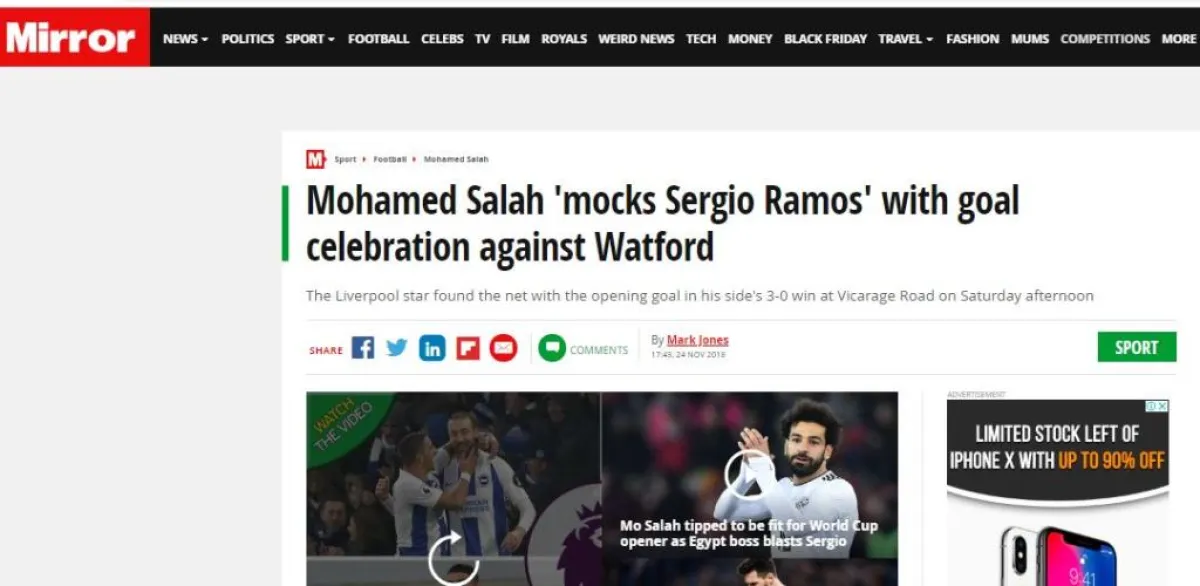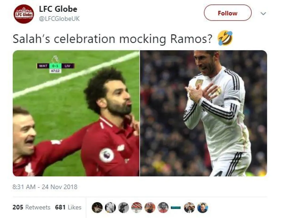 وذكر موقع «ميرور» أن مو صلاح يتمتع بمستوي رائع وظهور جيد جعل فريق يورجن كلوب مدرب ليفربول يحتل المركز الثاني فى البرلميرليج، وأن ما فعله صلاح بعد تسجيله الهدف الأول لفت الأنظار بقوة، وأن صلاح قام بالاحتفال بشكل نشهده للمرة الأولي على طريقة راموس ولكن بشكل ساخر، ويعتبر راموس هو العدو اللدود لصلاح بسبب مباراة نهائي دوري أبطال أوروبا بين ليفربول والريال عندما قام راموس بالتعدي على صلاح وخرج الأخير مصاباً مع بداية المباراة.