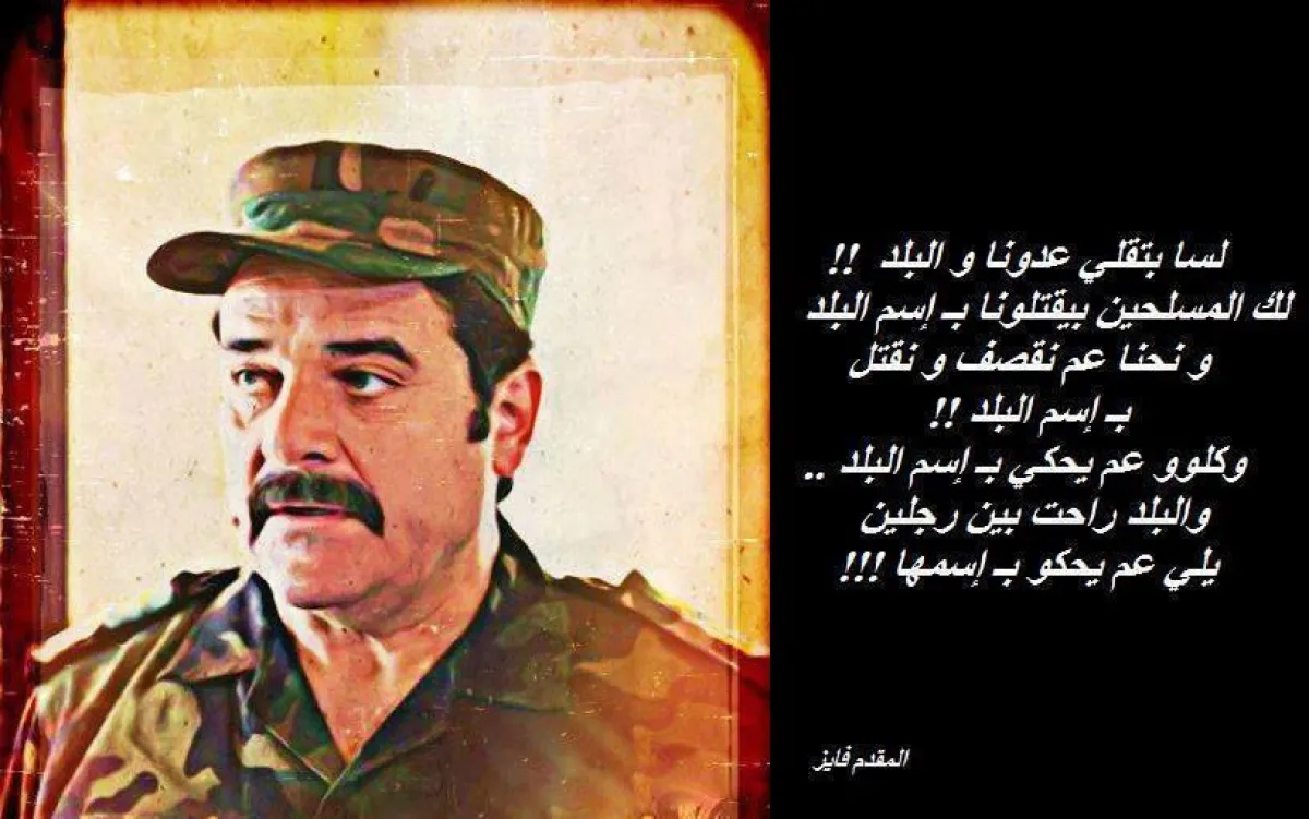 وبينما يتغنّى "المقدّم رؤوف بظلمه ويتمادى بذلك، بقوله مجاهرةً "الحياة مضرّة بالصحة" في تلميح واضح إلى عدم إعطاء أيّ قيمة لحياة الناس، يقول "المقدم فايز" المهزوم، الذي تُرك وحيداً في أرض المعركة، ورأى جنوده مقتولين أمام ناظريه، يبكي ويقول بحرقة: "لسا بتقلّي عدونا والبلد؟ لك المسلّحين بيقتلونا باسم البلد، ونحنا عم نقصف الناس ونقتل باسم البلد، وكلّو عم يحكي باسم البلد، والبلد راحت بين رجلين اللي عم يحكوا باسمها".
