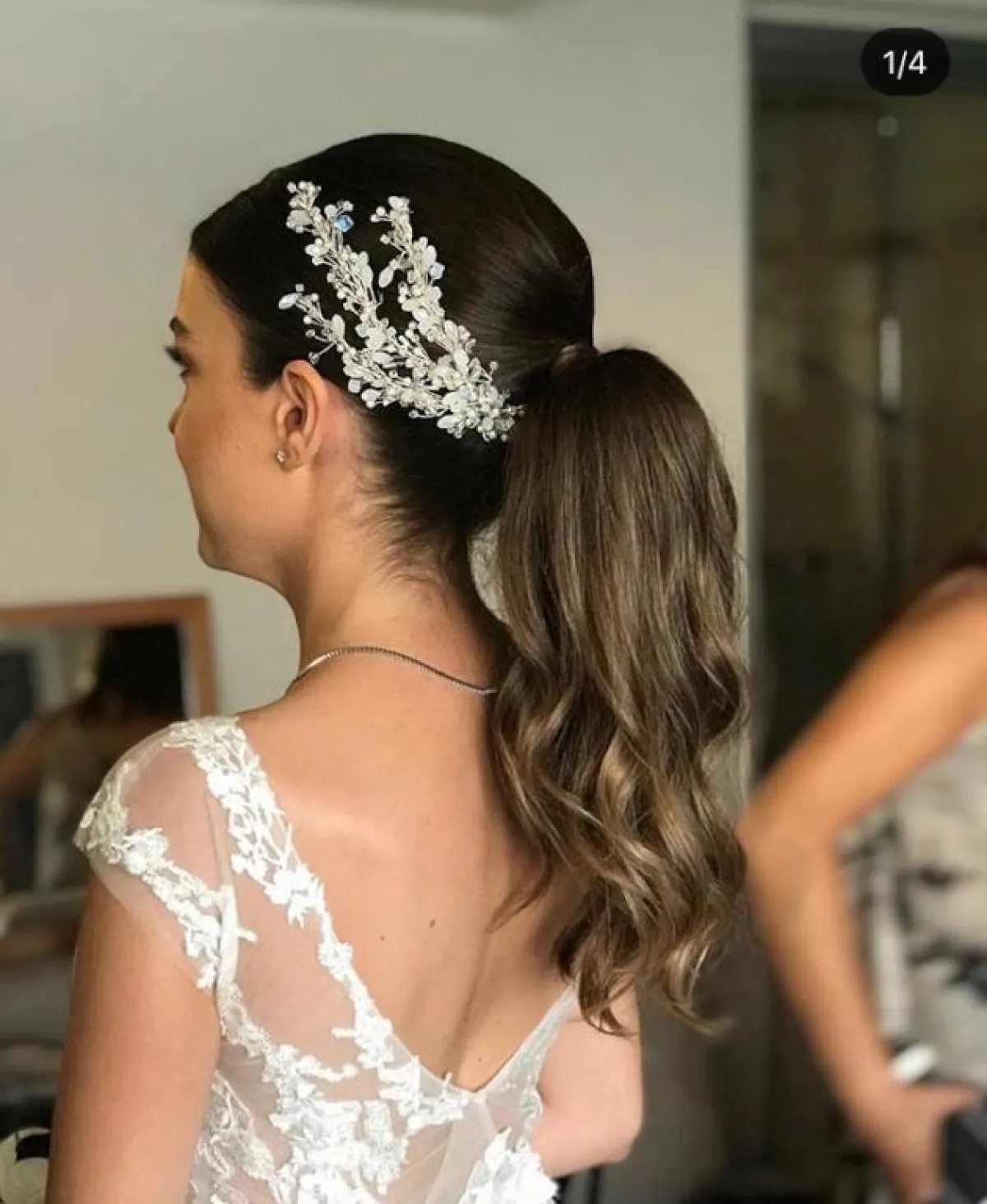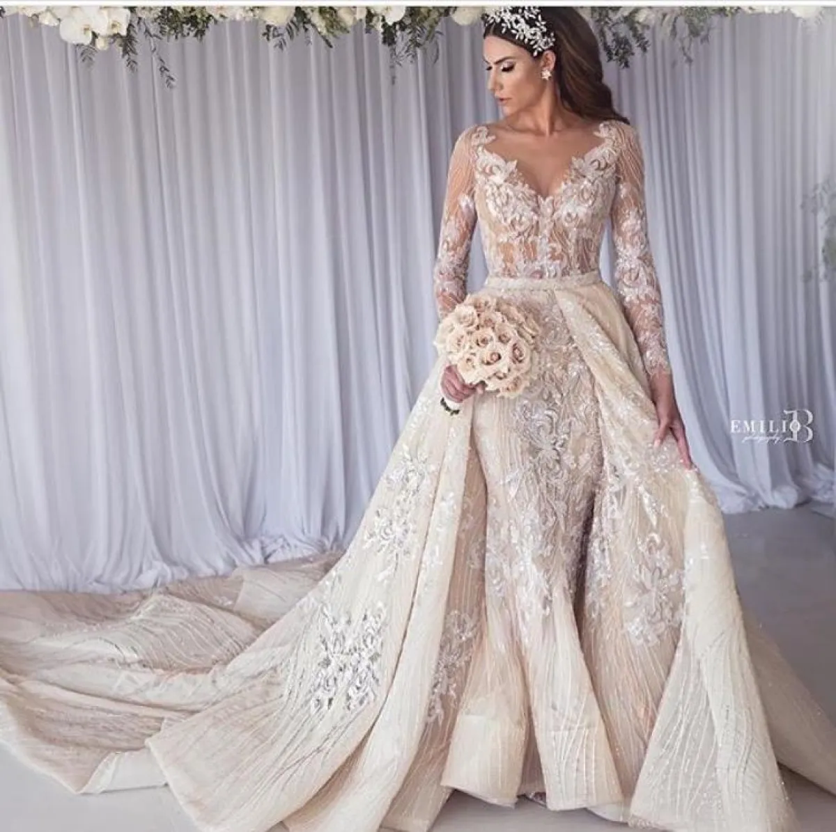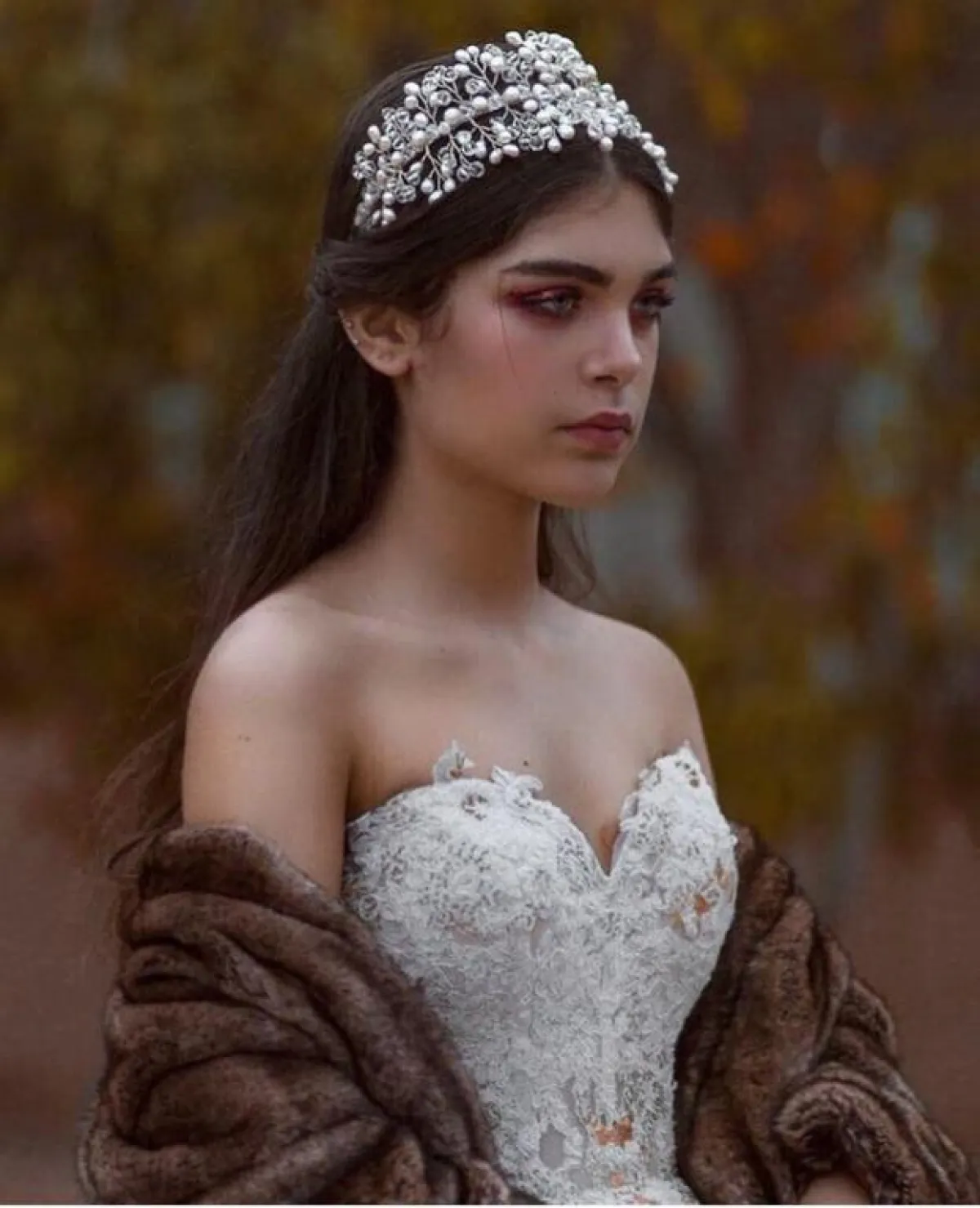 أو يمكنكِ اختيار التاج المرصع بحجر اللؤلؤ العاجي، مع أقراط الأذن الماسية المنسدلة، في نهايتها الحجر نفسه لاطلالة تجمع بين الفخامة والبساطة.