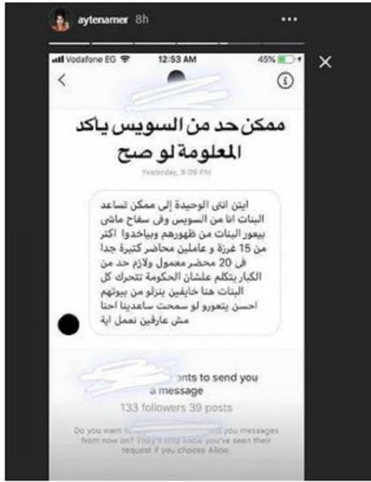 حالة الرعب التي تعيشها الفتيات في محافظة السويس، دفعت ببعضهن لإرسال استغاثة إلى الفنانة المصرية آيتن عامر، وكان ذلك عبر حسابها على موقع إنستغرام، ومن جهتها، عبرت الفنانة عن مدى صدمتها الشديدة من هذه الرسالة. وتخوفها مما قد يحدث بعد ذلك، حيث كانت قد نشرت صورة لرسالة الاستغاثة التي بعثت بها الفتيات، والتي جاء في نصِّها: «أنت الوحيدة اللي ممكن تساعد البنات، أنا من السويس وفي سفاح ماشي يؤدب البنات من ظهورهن وبياخدوا أكثر من 15 غرزة وعاملين محاضر كثيرة، البنات هنا خايفين ينزلوا من بيوتهن لو سمحتي ساعدينا».