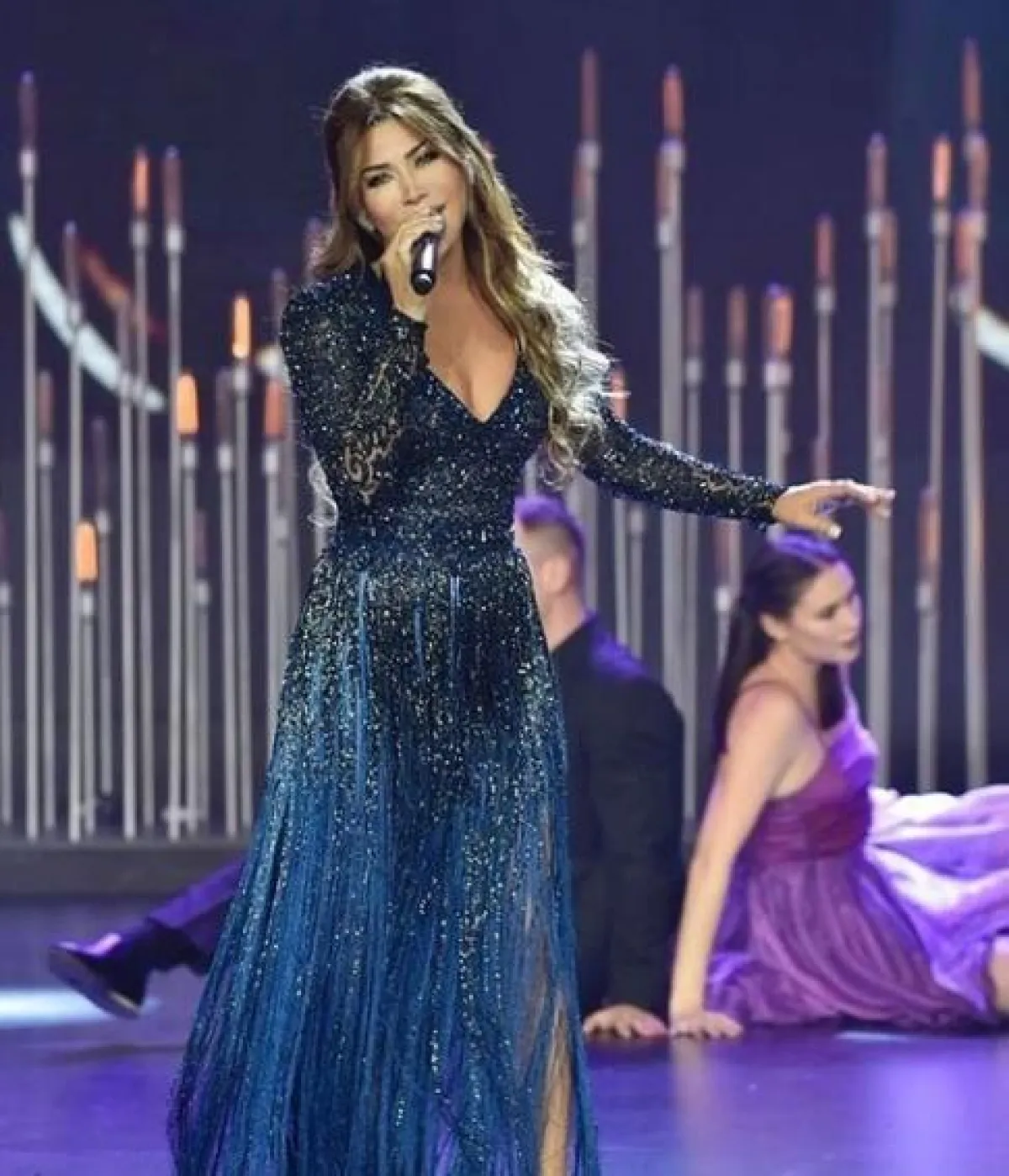 أيضاً تألقت نوال الزغبي في إحدى حفلاتها بفستان أزرق مرصع بفصوص برّاقة، تميز بتصميمه الفخم من توقيع labourjoisie، والفستان بقبّة V تكسب الجسم طولاً ونحافة مع أكمام طويلة.