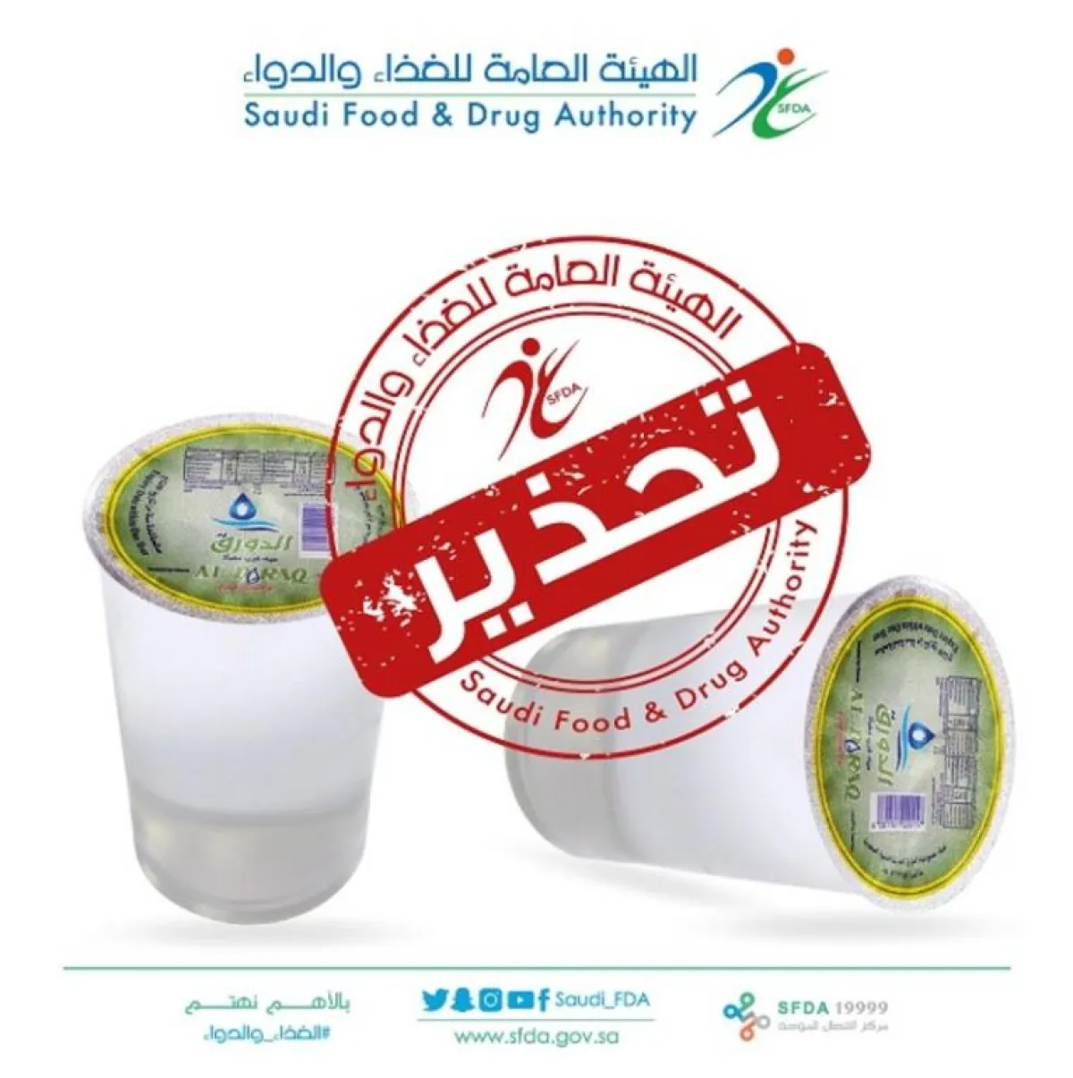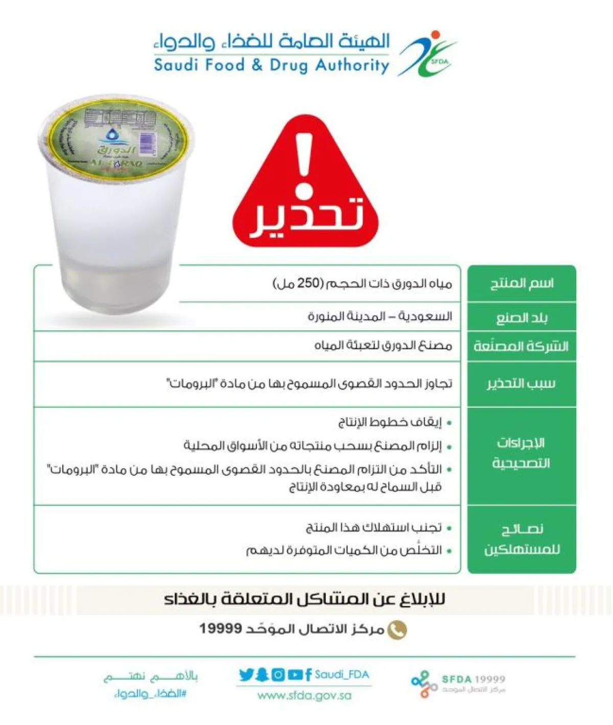 لضمان سلامة وصحة المستهلكين، حذّرت الهيئة العامة للغذاء والدواء من استهلاك مياه "الدورق" ذات الحجم (250 مل)، التي يُنتجها مصنع "الدورق" لتعبئة المياه بالمدينة المنورة؛ وذلك لتجاوزِها الحدود القصوى المسموح بها من مادة "البرومات".