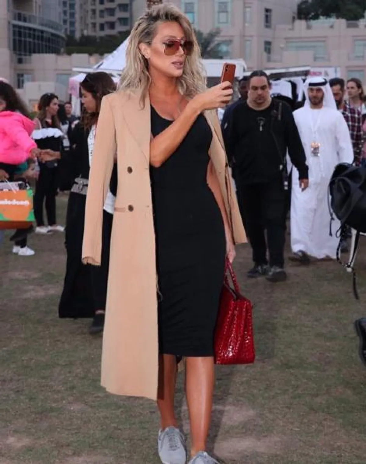 المعطف البيج رائج جدًّا لهذا الموسم، وقد اختارته مايا دياب مؤخرًا في إحدى اطلالاتها الكاجوال، حيث نسقته مع فستان أسود ميدي، وشنطة يد من الجلد باللون الأحمر، وحذاء رياضي رمادي، وأكملت اللوك بنظارات شمسية كبيرة.