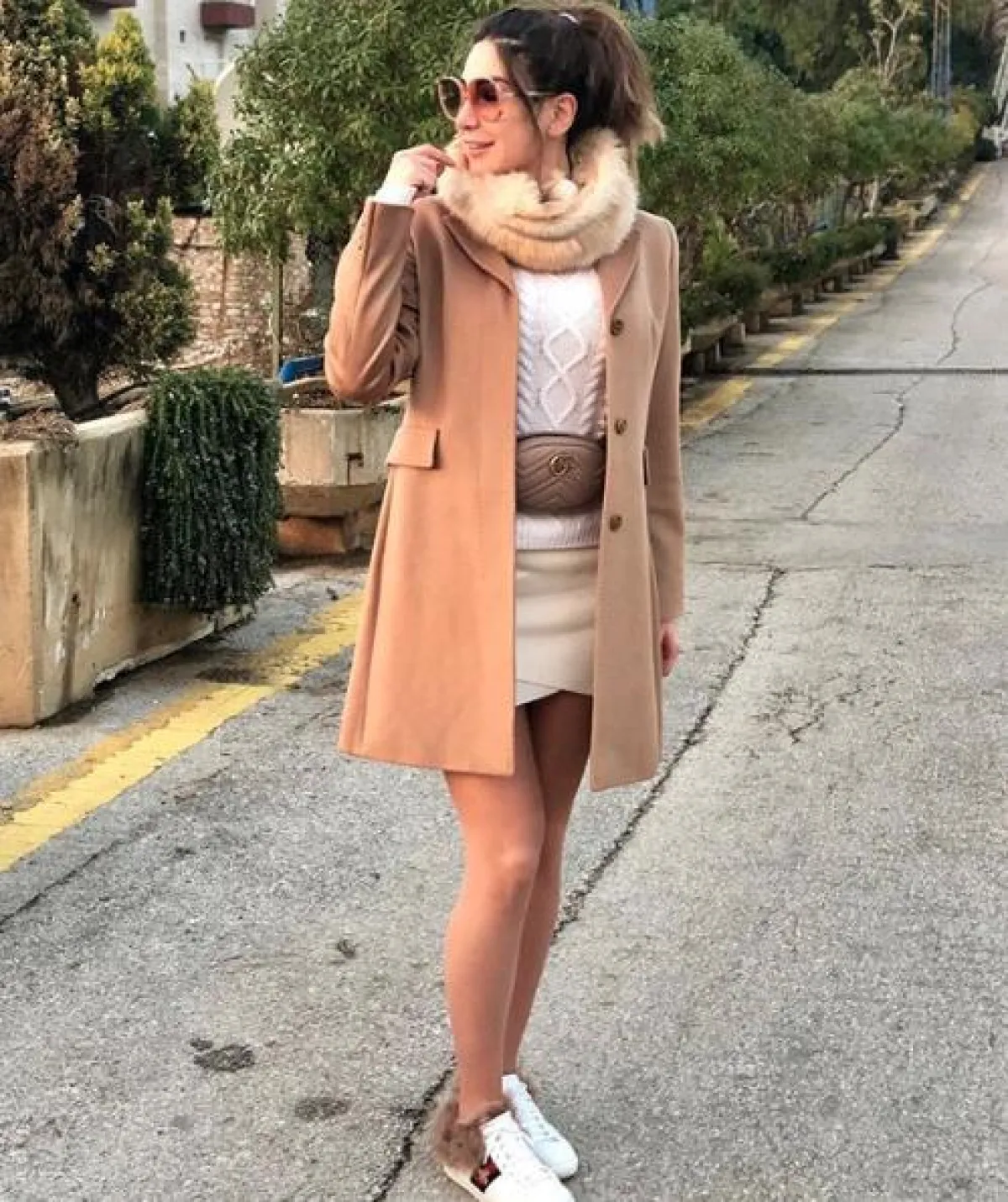 مايا دياب في لوك شبابي في المعطف البيج: