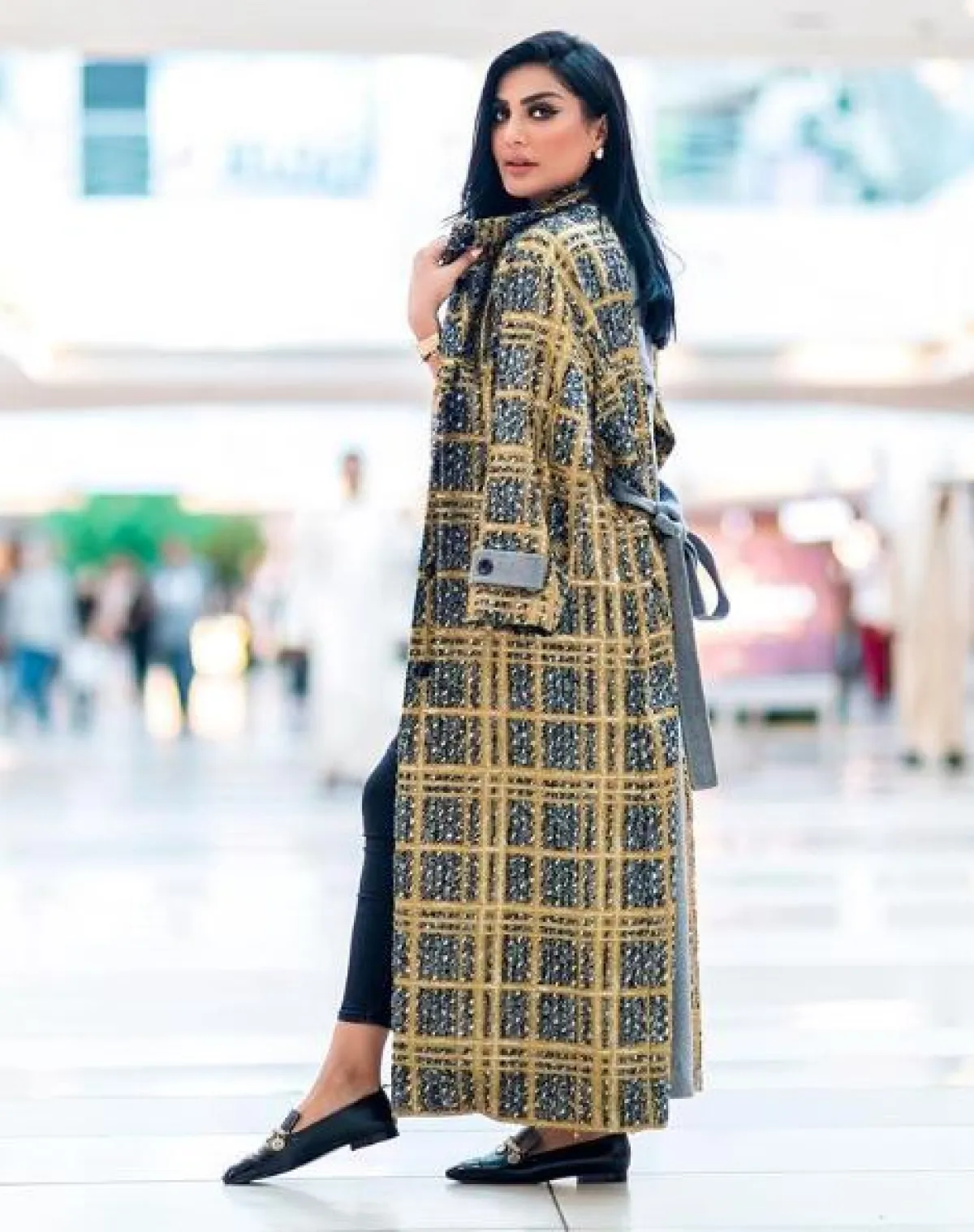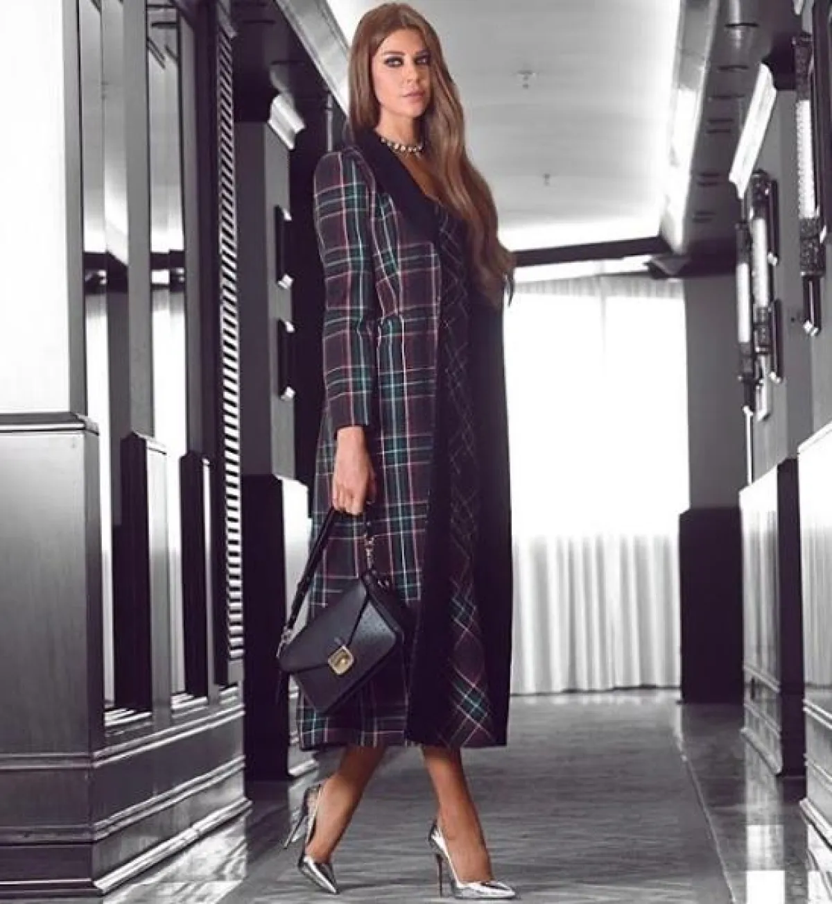 نسقت بثينة الرئيسي اطلالة عصرية مؤخرًا في نقشة الكارو أيضًا، حيث اختارتها على بدلة رسمية، وقد نسقت معها معطفًا شتويًّا طويلًا باللون الرمادي، وشنطة يد أنيقة من “ديور” Dior، وحذاءً بكعب عالٍ من الجلد باللون الأسود.