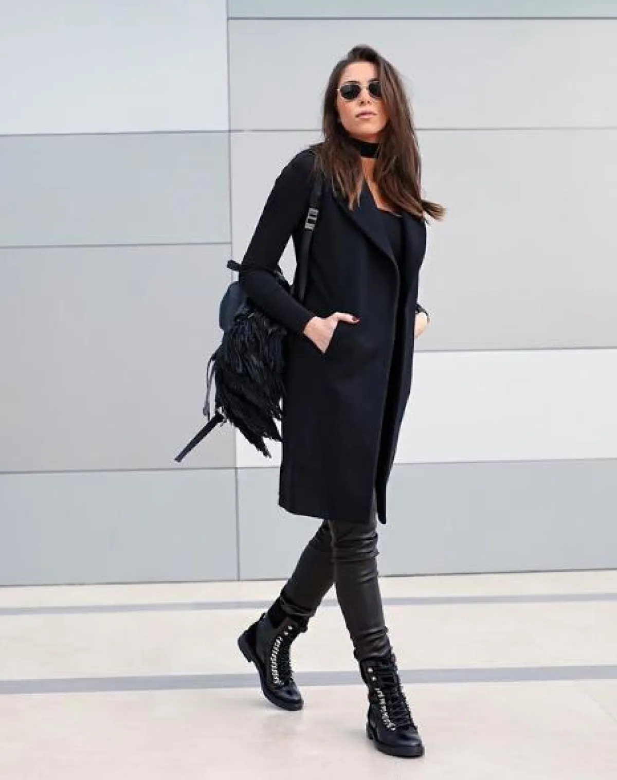 بثينة الرئيسي عصرية في المعطف الرمادي الطويل: