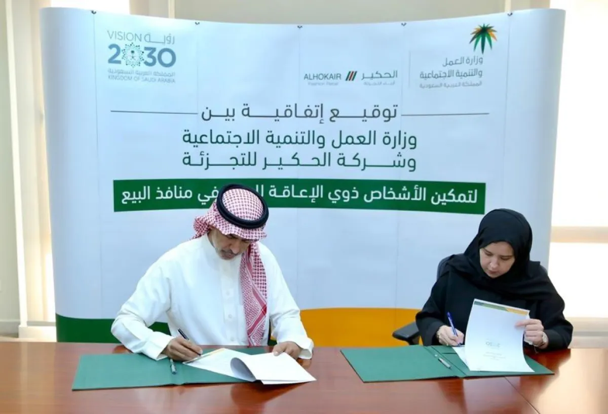 وقعت وزارة العمل والتنمية الاجتماعية أمس الأحد في مقرها بالرياض، اتفاقية تعاون مع شركة الحكير للتجزئة، تهدف إلى تمكين الأشخاص ذوي الإعاقة للعمل في منافذ البيع.