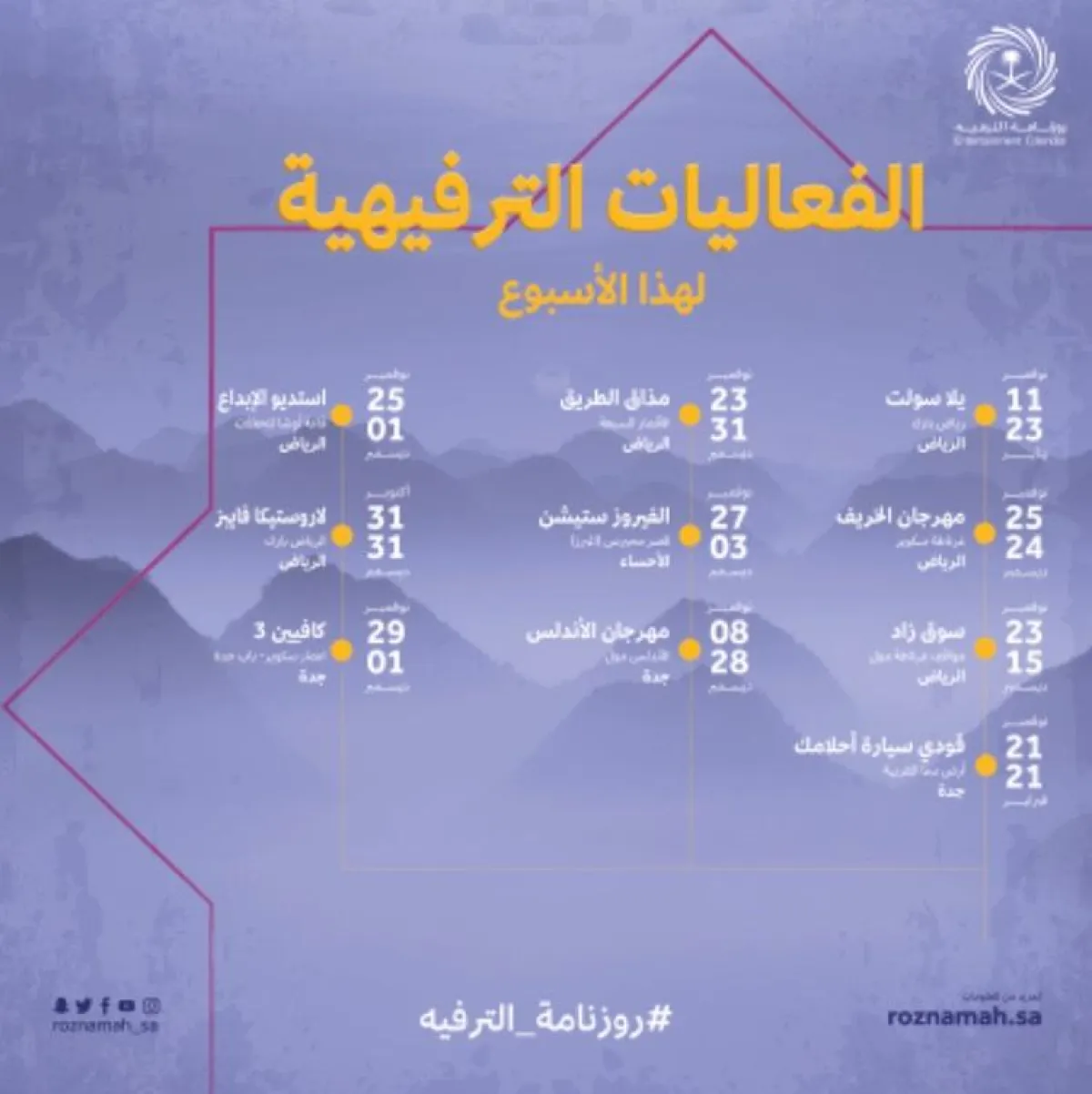 على وقع الأجواء الشتوية الجميلة التي تعيشها مختلف مناطق المملكة، تواصل "روزنامة الترفيه" فعالياتها الترفيهية خلال إجازة نهاية الأسبوع.