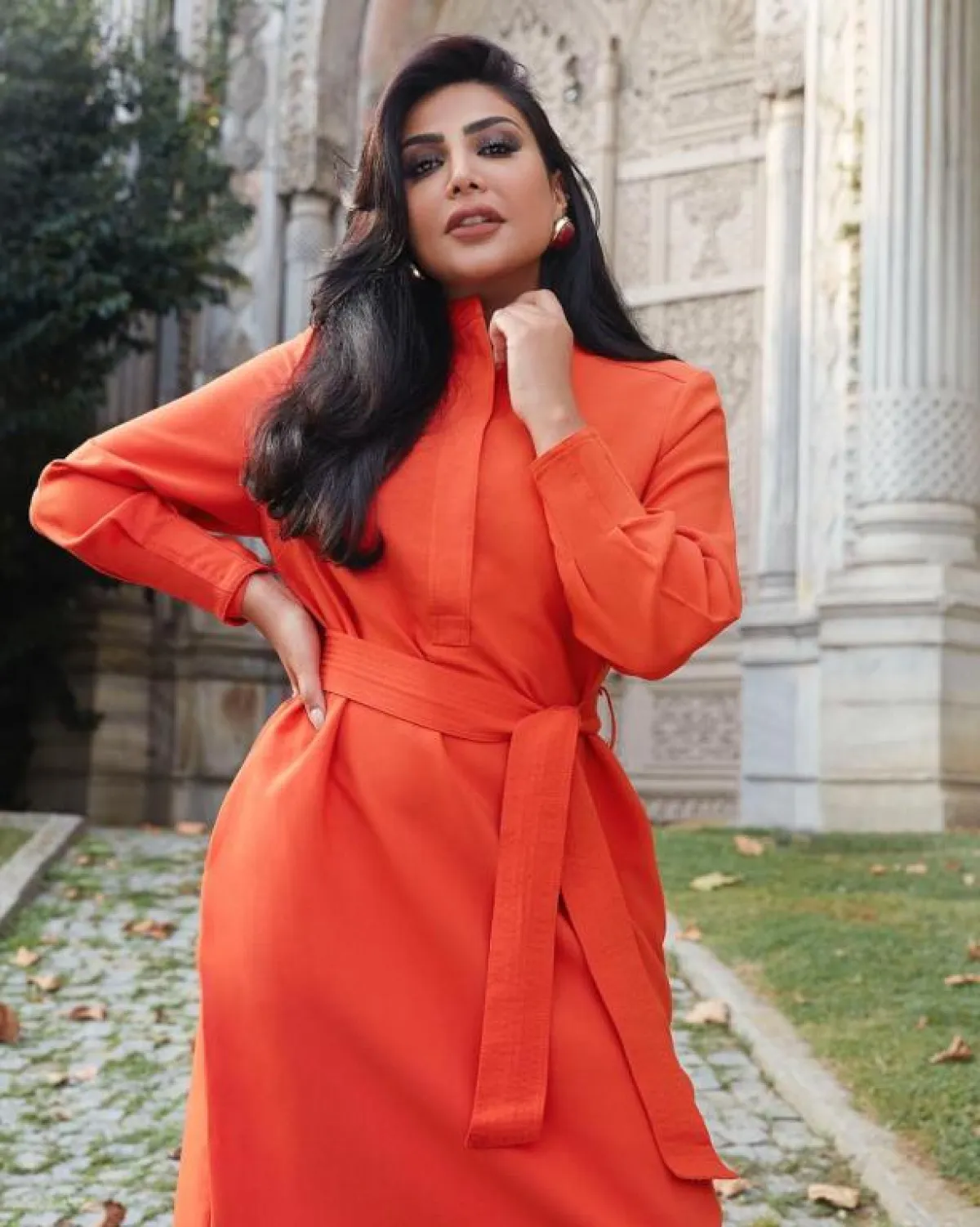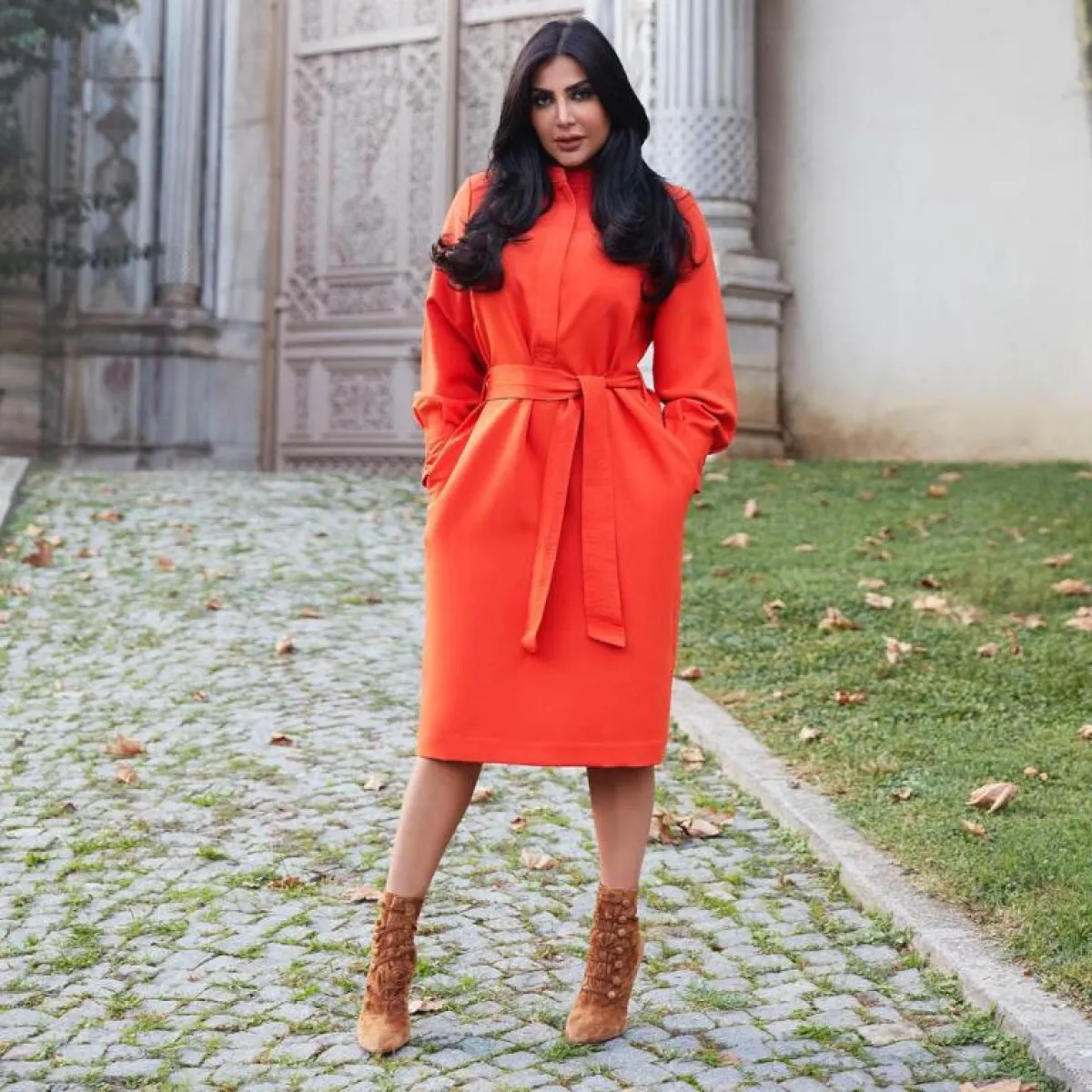 اعتمدت امل العوضي فستان باللون البرتقالي، متوسط الطول بأكمام طويلة، وزُين الفستان بـ حزام يضم الخصر، وهو أسلوب تكرره كثيراً لتكشف عن تناسق قوامها، كما نسقته مع بوت باللون نفسه، يمتد بعنق متوسط وكعب رفيع ليعزز أنوثتها، وتعد هذه الإطلالة موفقة، لاسيما مع اختيار اللون البرتقالي الدافئ ليحد من برودة الخريف.
