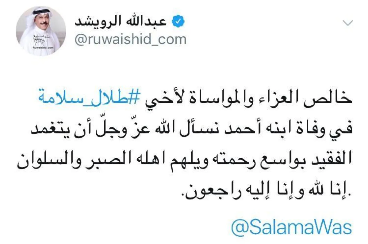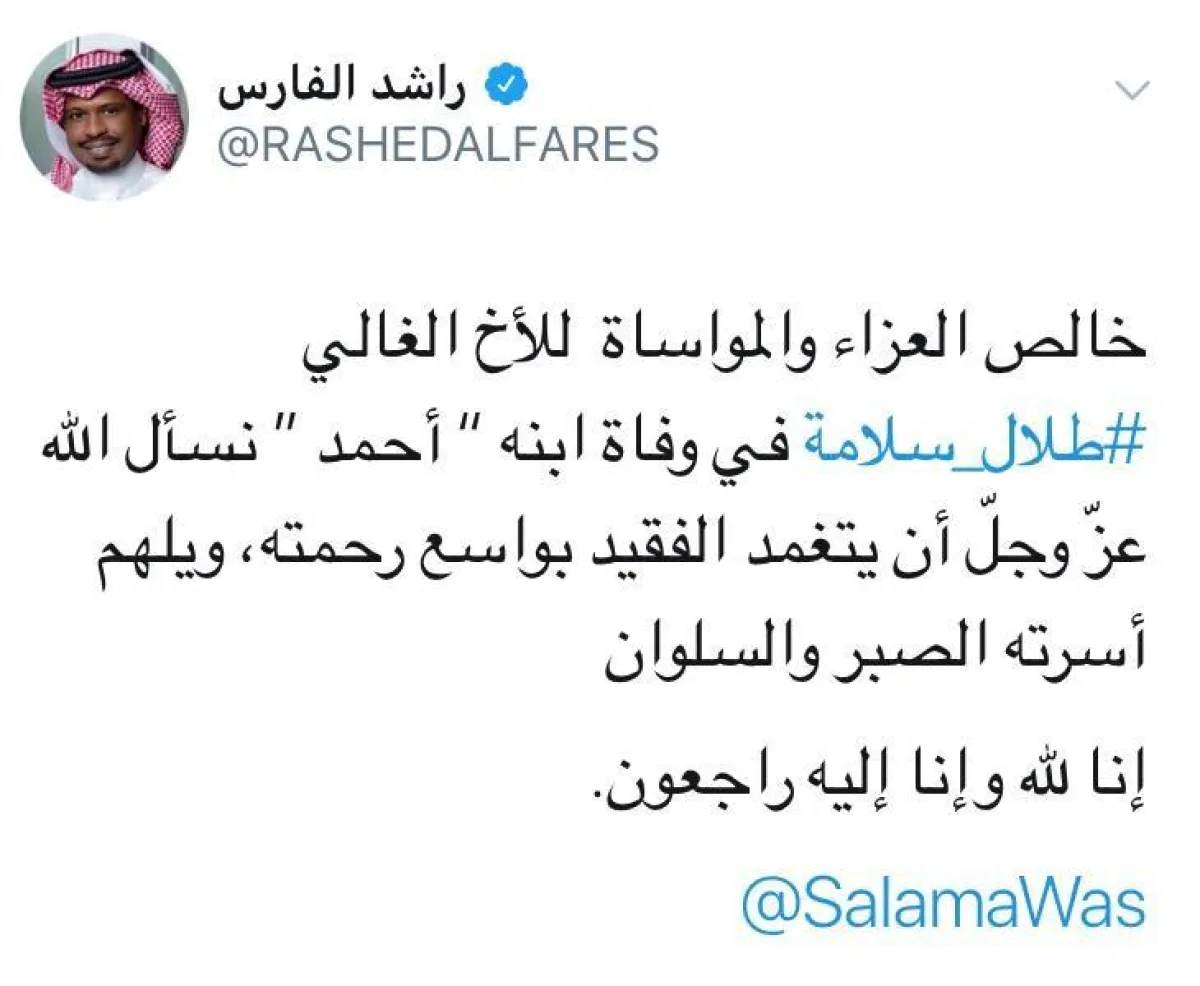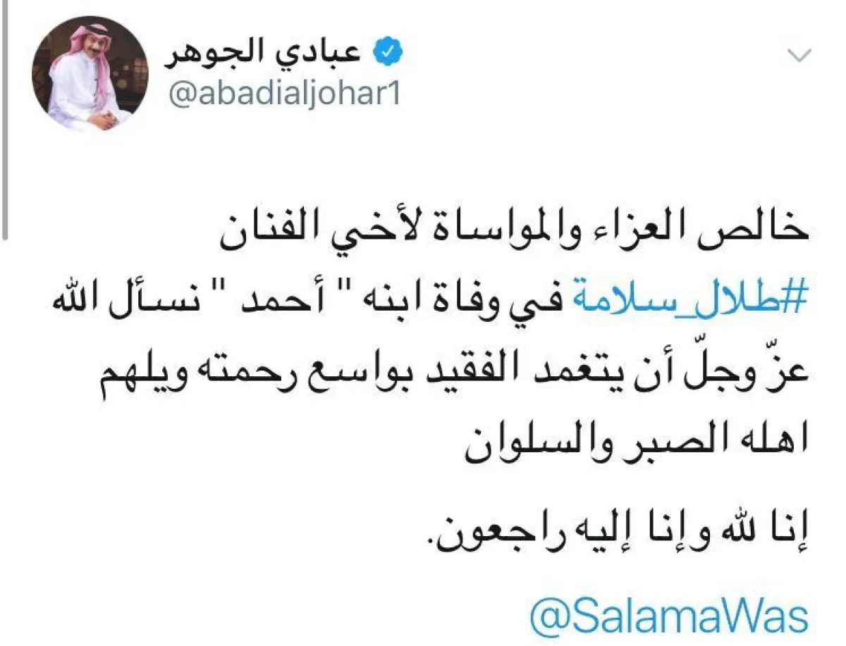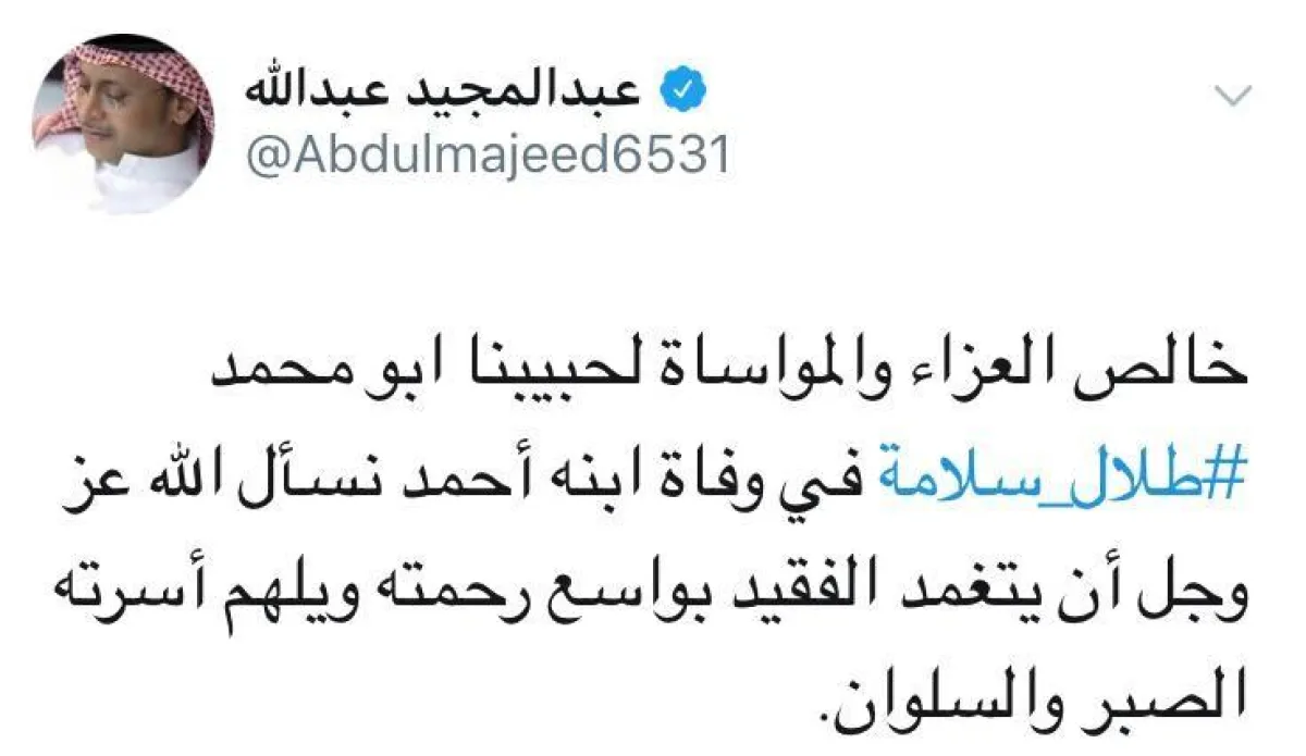 - إذ كتب الفنان عبدالمجيد عبدالله على حسابه: "خالص العزاء والمواساة لحبيبنا أبو محمد #طلال_سلامة في وفاة ابنه أحمد. نسأل الله عز وجل أن يتغمد الفقيد بواسع رحمته ويلهم أسرته الصبر والسلوان".