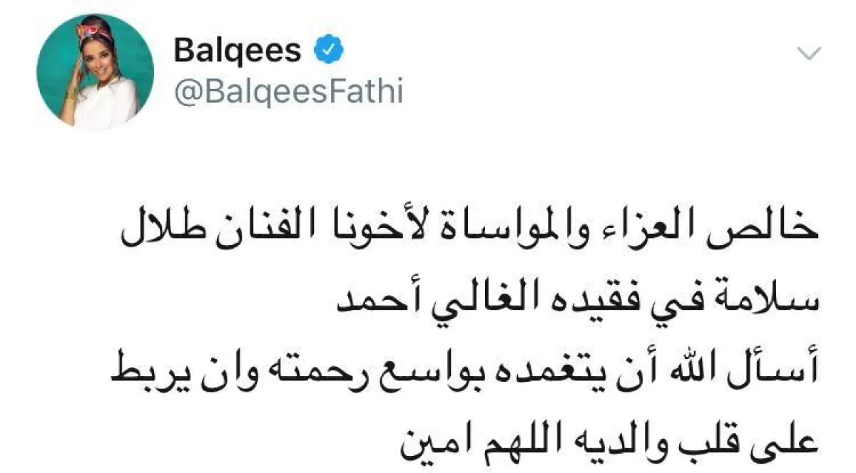 - فيما كتبت الفنانة بلقيس في حسابها الرسمي بتويتر: "خالص العزاء والمواساة لأخينا الفنان طلال سلامة في فقيده الغالي أحمد. أسأل الله أن يتغمده في واسع رحمته وأن يربط على قلب والديه. اللهم آمين".