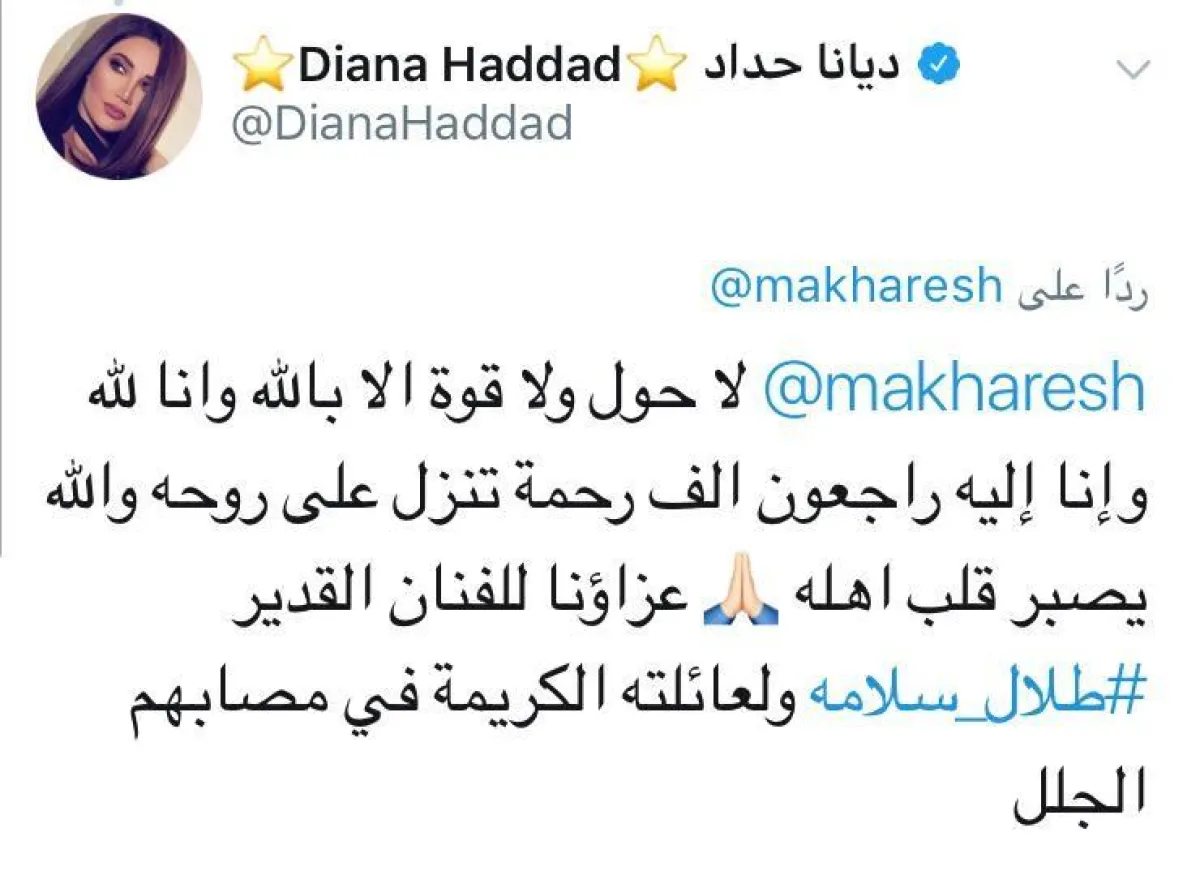 - وقدمت الفنانة ديانا حداد تعازيها لطلال وعائلته الكريمة كاتبة: "لاحول ولا قوة إلا بالله، وإنا لله وإنا إليه راجعون. ألف رحمة تنزل على روحه، والله يصبر قلب أهله. عزاؤنا للفنان القدير طلال سلامة ولعائلته الكريمة في مصابهم الجلل".