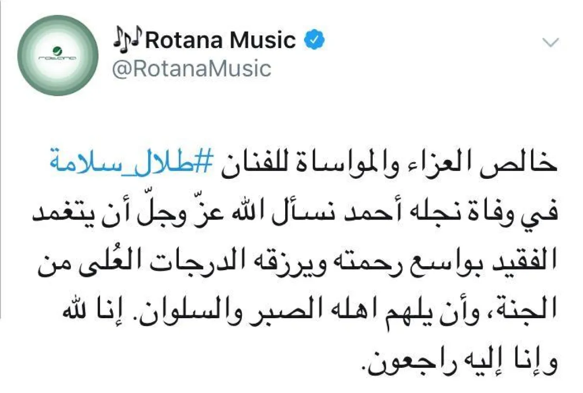 - وأعرب الحساب الرسمي لـ "روتانا للصوتيات والمرئيات" في تغريدة عبر تويتر عن خالص العزاء والمواساة للفنان طلال كاتباً "خالص العزاء والمواساة للفنان طلال سلامة في وفاة نجله أحمد. نسأل الله عز وجل أن يتغمد الفقيد في واسع رحمته ويرزقه الدرجات العُلى من الجنة، وأن يلهم أهله الصبر والسلوان. إنا لله وإنا إليه راجعون".
