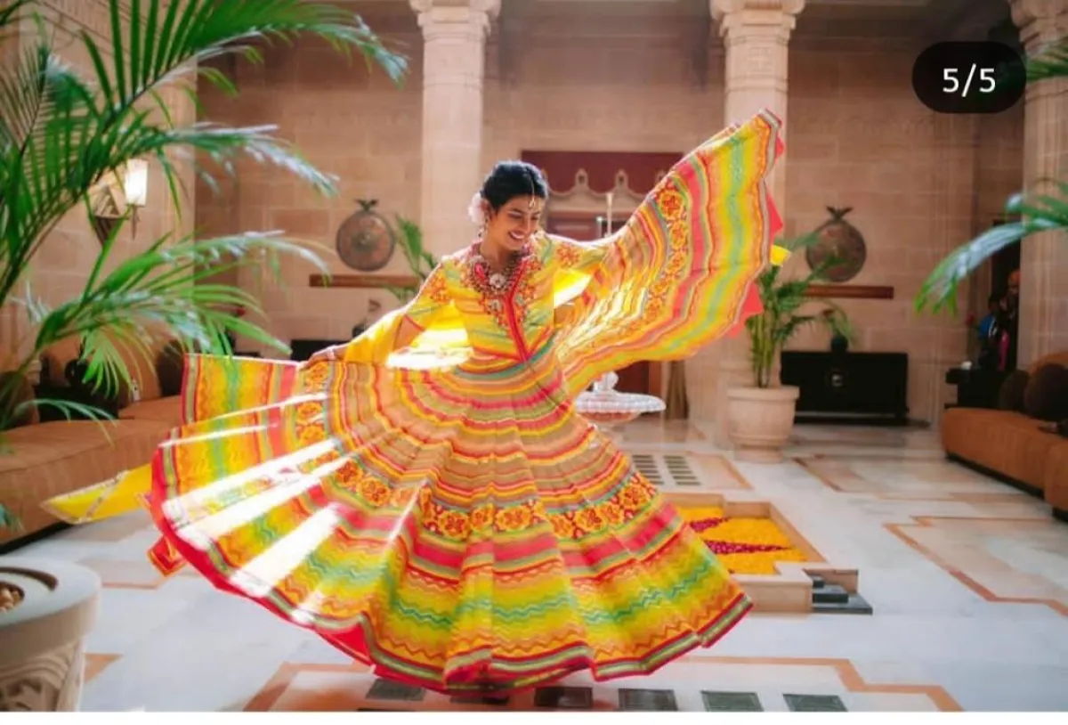 وتألقت النجمة بثوب هندي تقليدي ارتدته خلال مراسم زفافها التقليدية طغى عليه اللوم الأصفر والأحمر والأخضر وبدا محتشماً بينما ارتدى زوجها بدلة هندية الطراز باللون البيج .