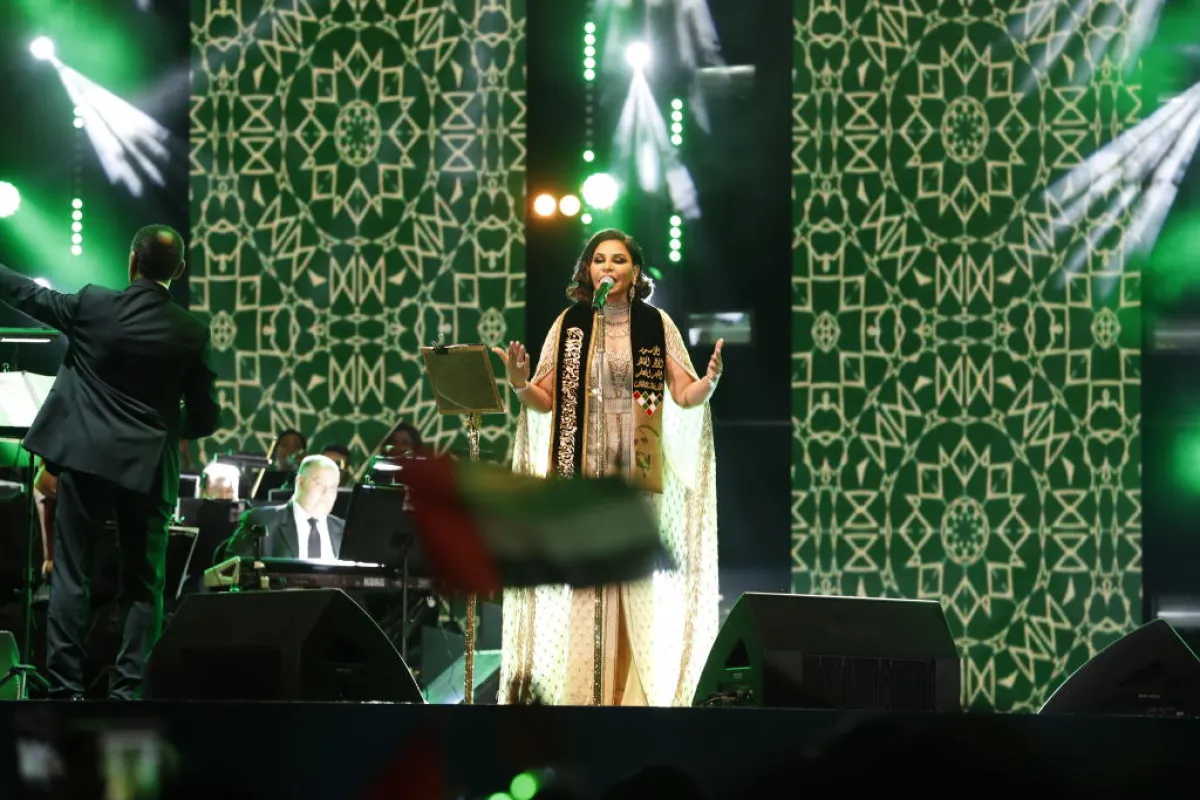 بدأت أحلام وصلتها بالنشيد الوطني الإماراتي، الذي ألهب حماس الحضور، وتبعته بعديد الأغاني التي شاركها الحضور غناءها، من بينها «ومستغرب - ليه متضايق - هلا يا مرحبا وأهلا - لا تصدقونه - إحلف - طلقة - بغيضك - وليه»، وتبادلت المزاح أكثر من مرة مع الحضور، ثم زفت لجمهور حفلها خبراً سعيداً بوصول جواز السفر الإماراتي إلى المرتبة الأولى عالمياً وهو ما أسعد الحضور كثيراً.
