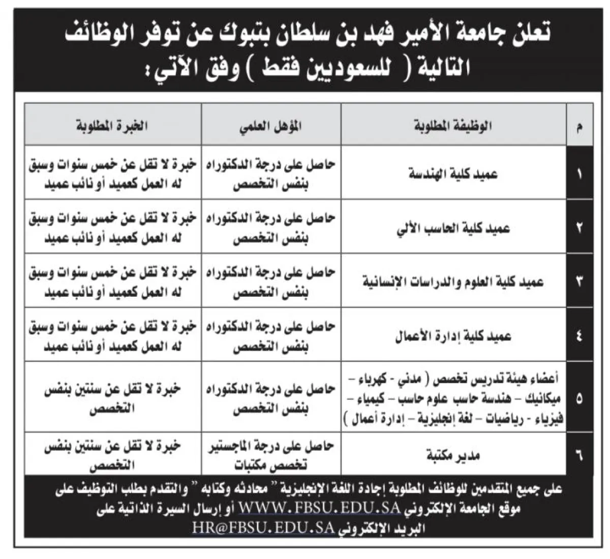 كشفت جامعة الأمير فهد بن سلطان في تبوك عن توفّر وظائف إدارية وأكاديمية شاغرة، وفقاً للتفاصيل الآتية: