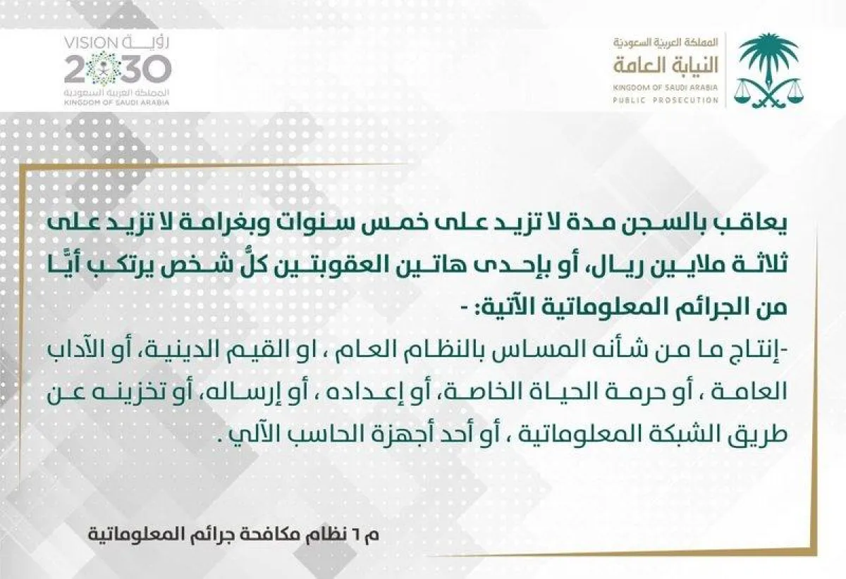 وقالت النيابة، في البيان الذي نشرته عبر حسابها الرسمي على موقع التواصل الاجتماعي "تويتر"، اليوم الإثنين، إن تلك الأفعال تعد من الجرائم التي يعاقب عليها بالسجن 5 سنوات وغرامة 3 ملايين ريال.