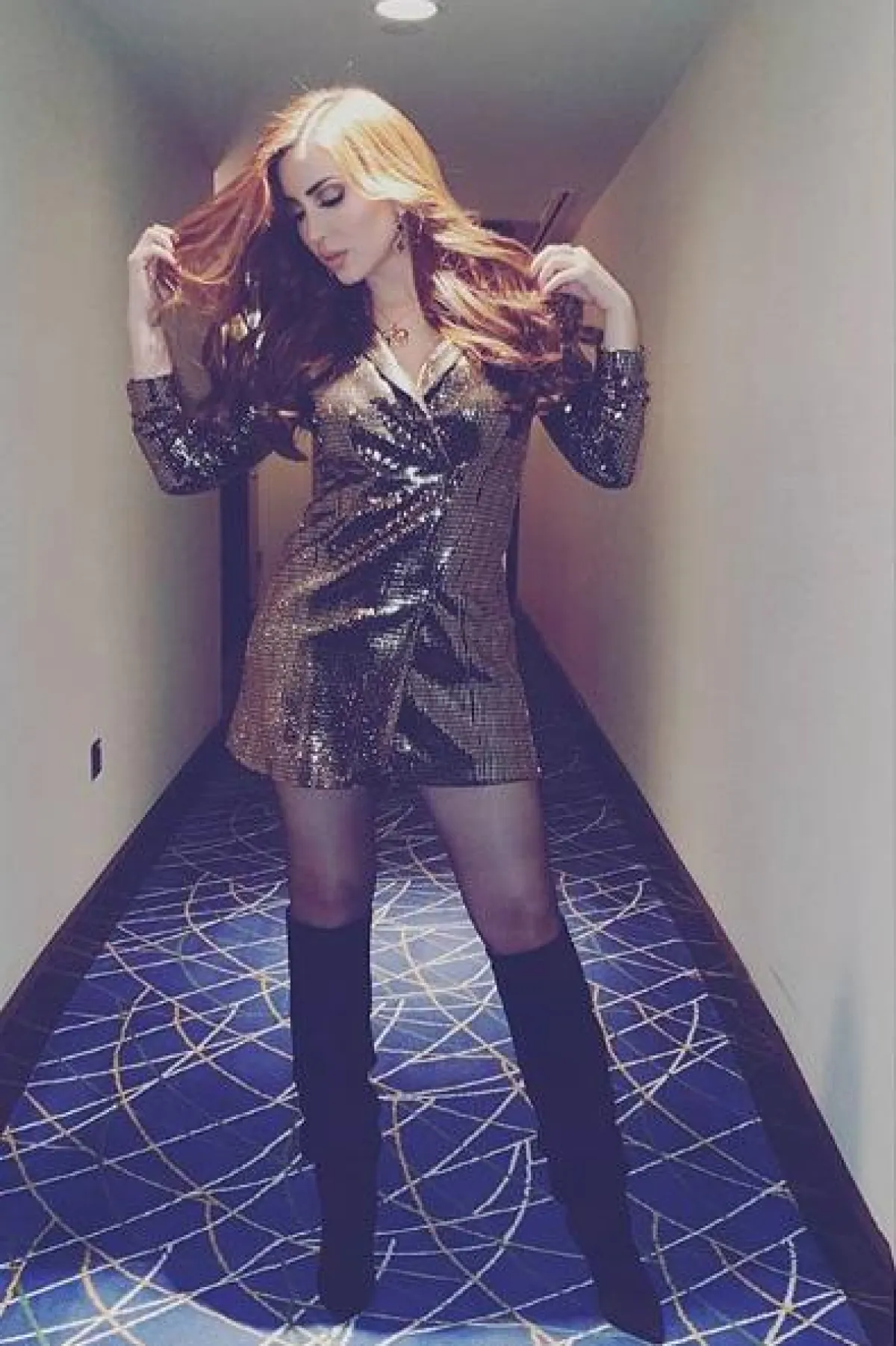 اختارت نسرين طافش في إحدى اطلالاتها، فستانًا ذهبيًّا قصيرًا من الترتر البراق بقصة البليزر، وقد نسقت معه جزمة عالية وصل طولها حد الركبة باللون الأسود، اختارتها من “سانت لوران” Saint Laurent وأكملت اللوك باكسسوارات باللون الذهبي.