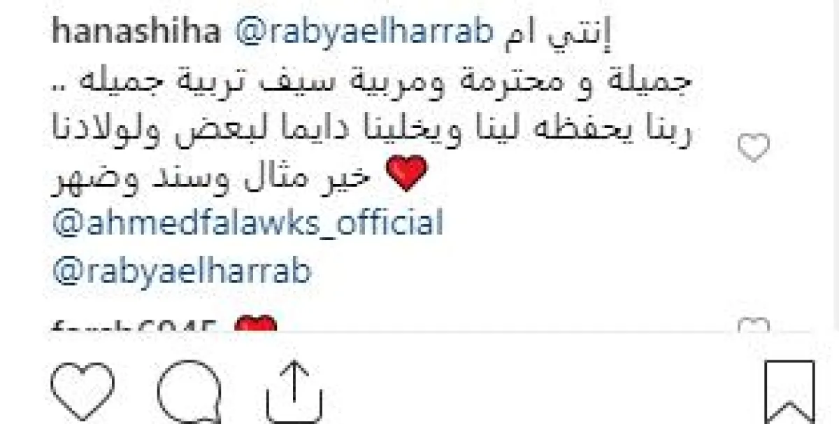 هنا شيحة لم تفوّت الفرصة ووجهت رسالة غزل إلى طليقة زوجها قائلة: إنتِ أم جميلة ومحترمة ومربيّة سيف تربية جميلة، ربنا يحفظه لينا ويخلّيه سند لأولادنا.