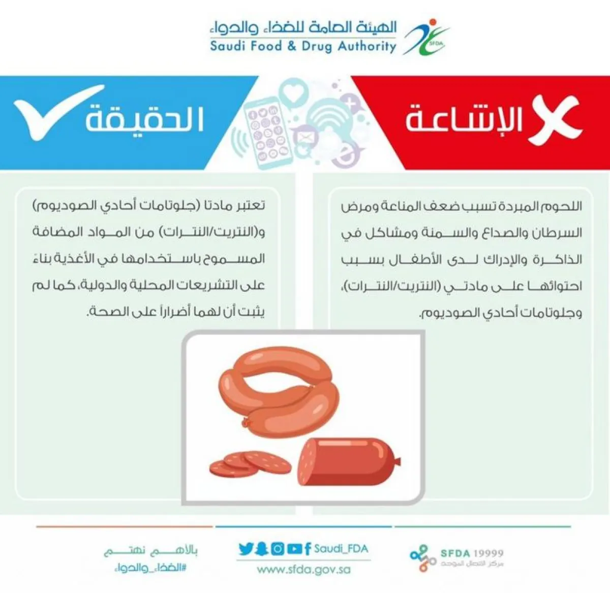 كشفت الهيئة العامة للغذاء والدواء حقيقة الشائعات التي تتردد عن أن اللحوم المبردة تسبب السرطان وبعض الأمراض الأخرى، بسبب احتوائها على مادة "النتريت/النترات"، ومادة "جلوتامات أحادي الصوديوم".