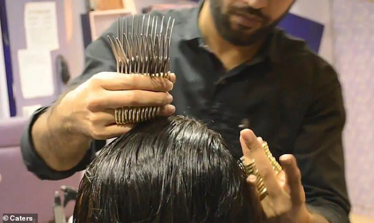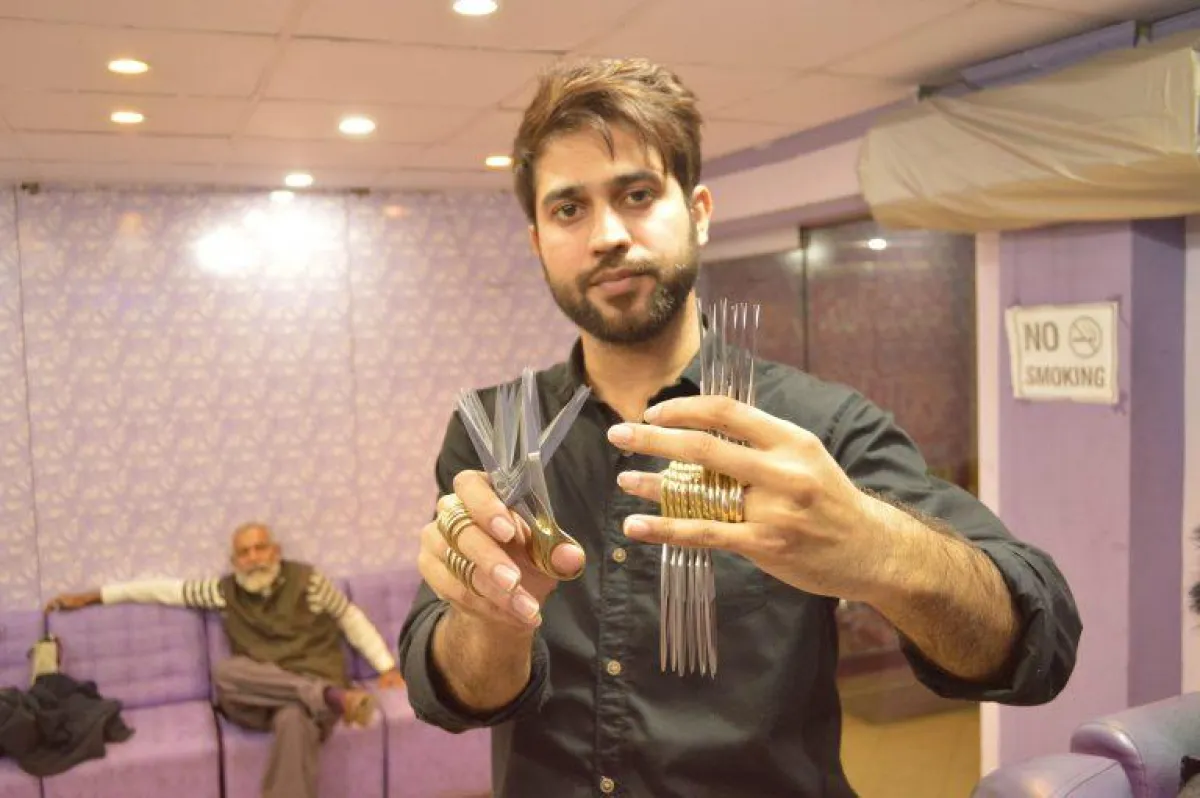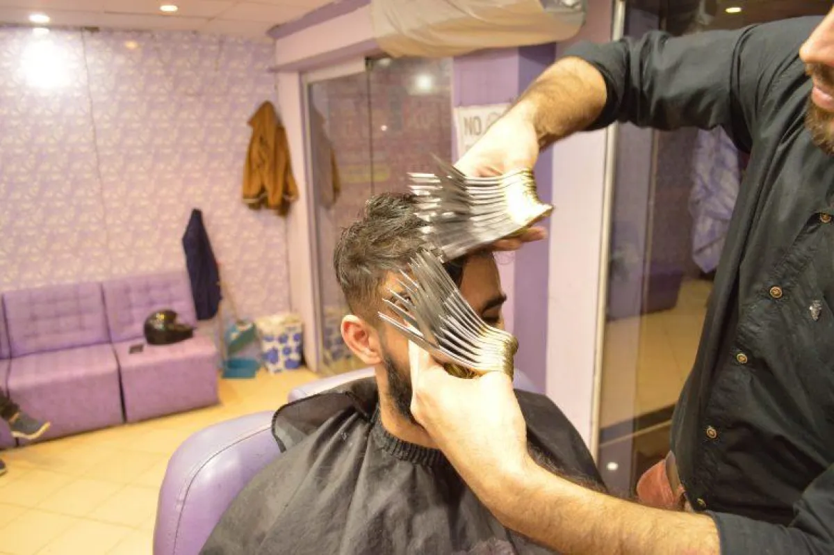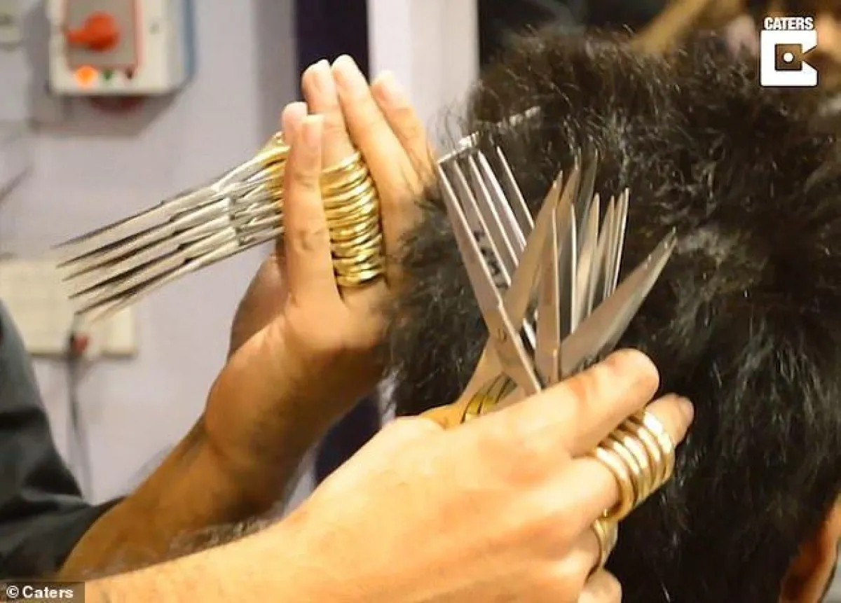 قد نشاهد استخدام أدوات غريبة لقص الشعر مثل القص بالنار والقص بالساطور، والسكين .. لكن حلاقاً باكستانياً لم يعتمد أداة غريبة في قص شعر زبائنه، ولكنه يستخدم عدداً مبالغاً فيه من المقصات للقيام بذلك.