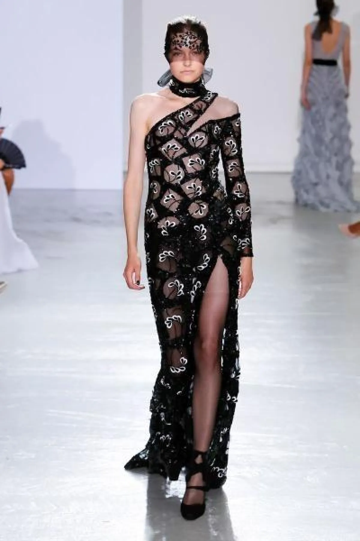 كما برزت الفساتين المنفوشة مع كتف واحد لتمنح العروس إطلالة فخمة ولافتة للأنظار، مثل فستان انيس دي سانتو Inis Di Santo الأسود المزين بالورود البيضاء، وفستان مونيك لولييه Monique Lhuillier الوردي بالتنورة التول.