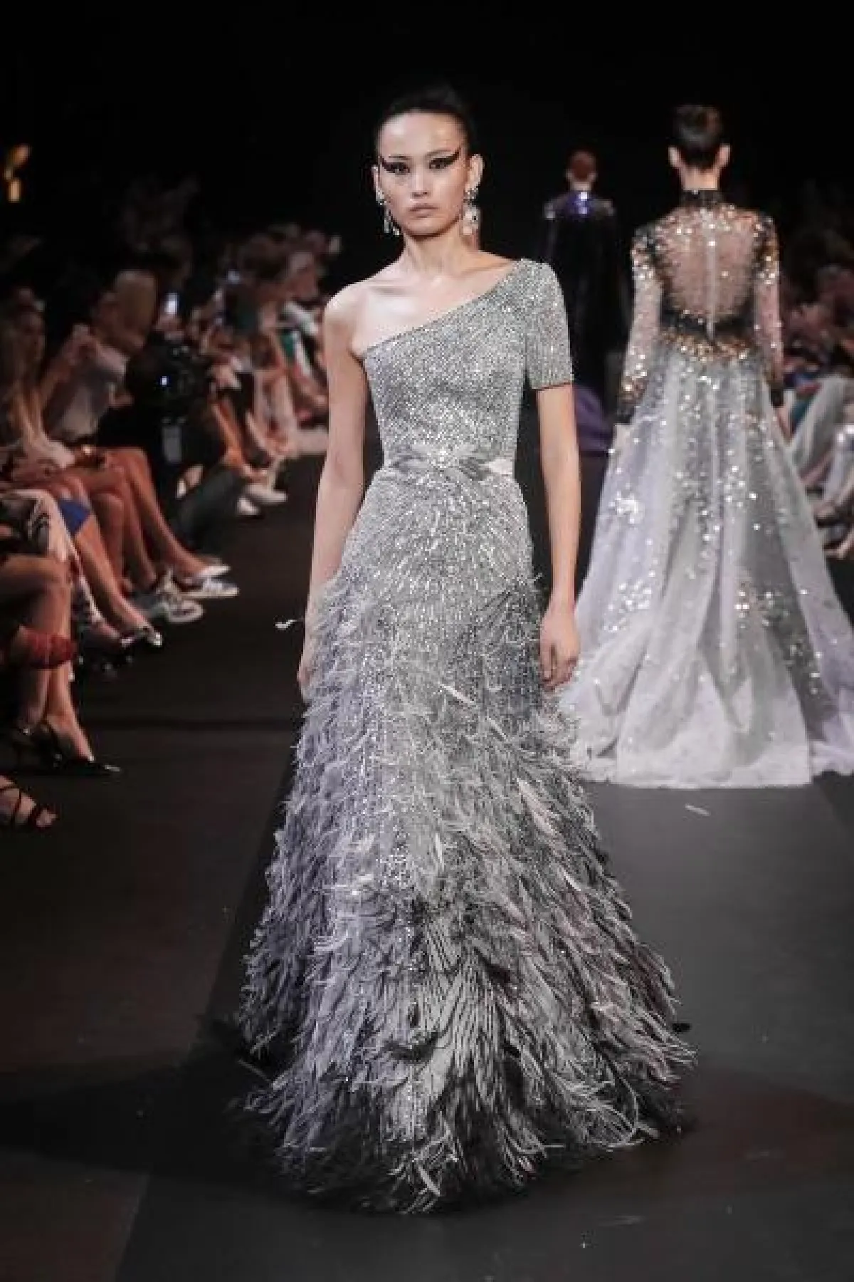 تميز فستان جورج حبيقة بالكم الواحد بتصميم الأنثوي الذي يبرز القوام، مع لمسة فاخرة بالريش الذي يغطي التنورة.