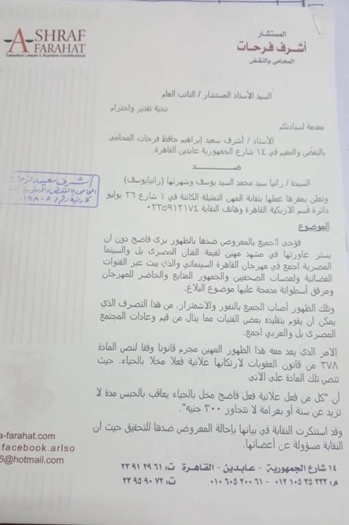 رانيا حضرت التحقيقات برفقة شعبان سعيد، محامي نقابة المهن التمثيلية المكلف بمهمة الدفاع عن الفنانة أمام النيابة العامة، وتم إثبات تنازل المحامون عمرو عبدالسلام، وحميدو جميل البرنس، ووحيد الكيلاني، عن البلاغ المقام منهم ضد الفنانة رانيا يوسف بسبب فستانها في حفل ختام مهرجان القاهرة السينمائي، كما تم التنازل عن الجنحة المباشرة ضدها أمام محكمة الجنح التي حُدد لها جلسة 12 يناير المقبل لنظرها، ولكن يتبقى بلاغ المحامي اشرف فرحات لا يزال سارياً.